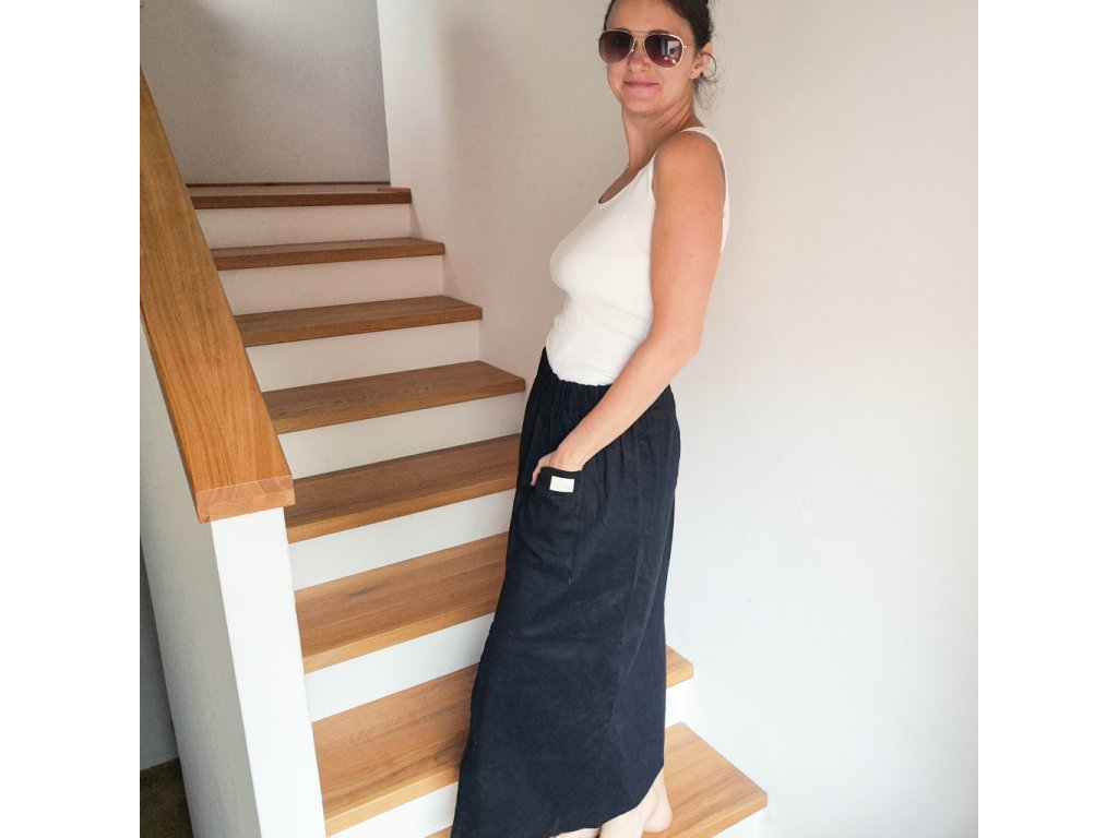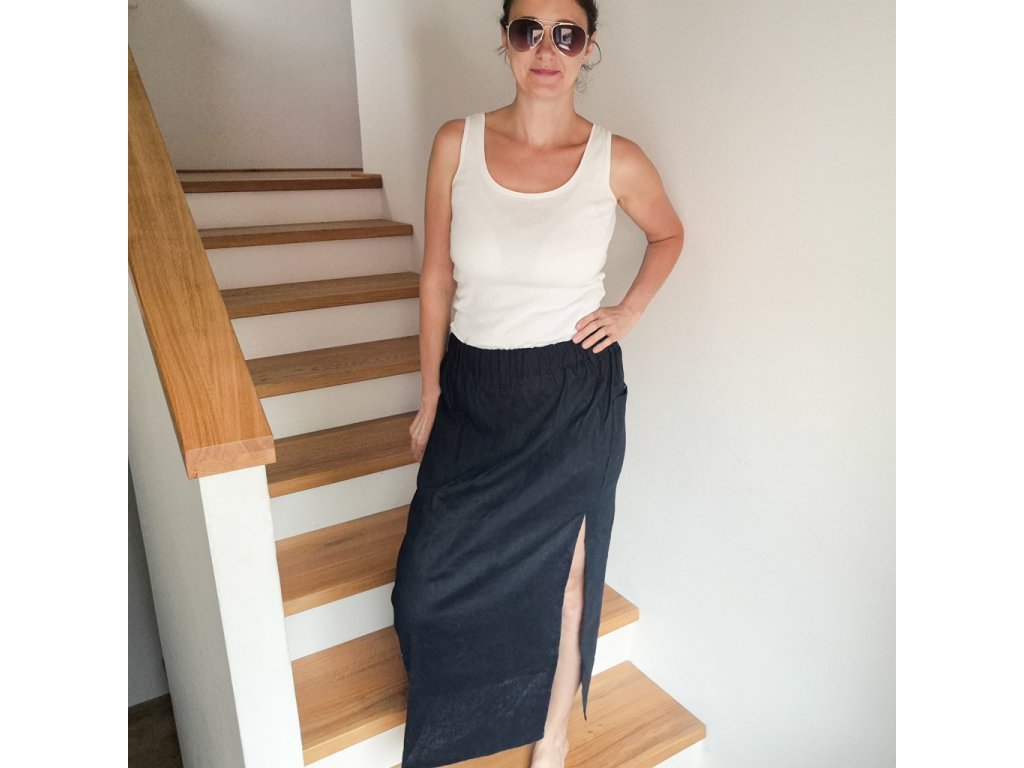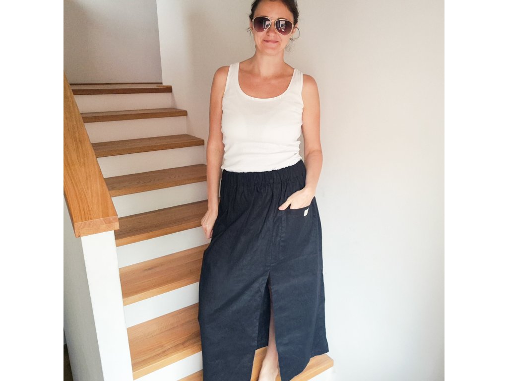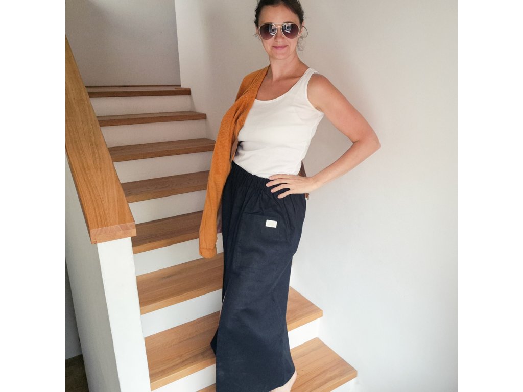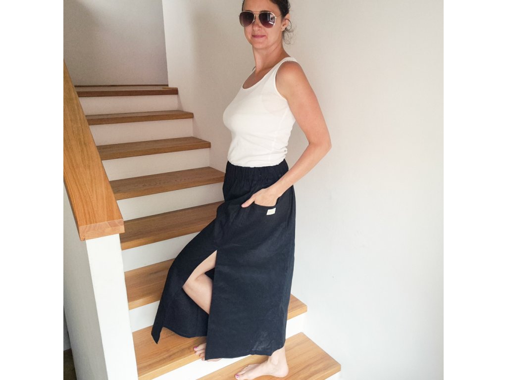 Dlouhá sukně ušitá ze směsi lnu kombinuje přírodní vzhled s pohodlím. Rozparek ke koleni dodává volnost pohybu a lehkost, kapsa zajišťuje praktičnost pro každý den. Směs lnu se příjemně nosí, je prodyšná a časem získává ještě větší měkkost. Díky svému jednoduchému a nadčasovému střihu je tahle sukně snadno kombinovatelná a využitelná od běžného dne po letní večer.
