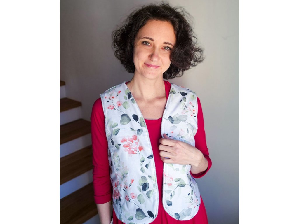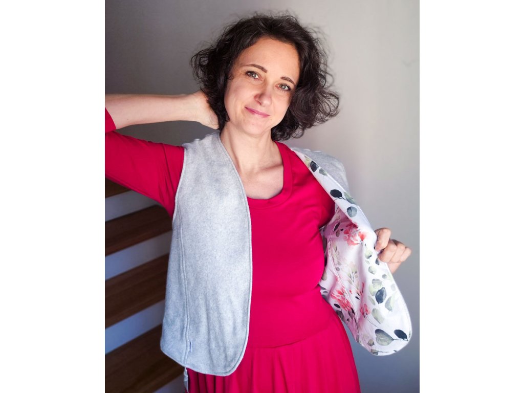 Elegantní vesta, která díky svému střihu působí nadčasově a snadno se kombinuje. Je ušitá z příjemného Bio bavlněného fleecu, který krásně zahřeje a nedráždí pokožku. Přední díl je střižený do obloučku, takže působí elegantně ale zároveň i ležérně. Zajímavým detailem je vnitřní podšívka z bavlněného designového popelínu, která dodává vestě hravý kontrast a jemně ji oživí.