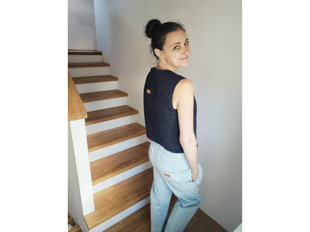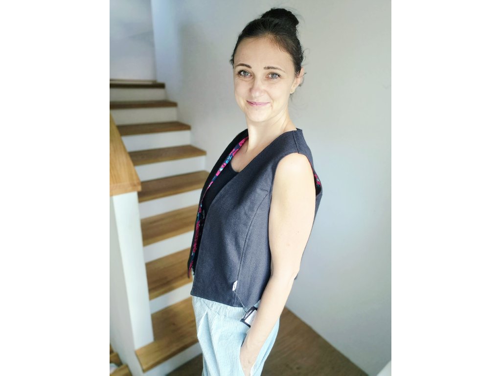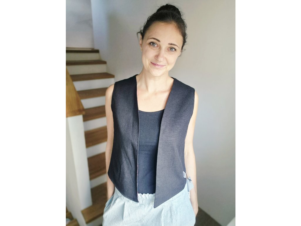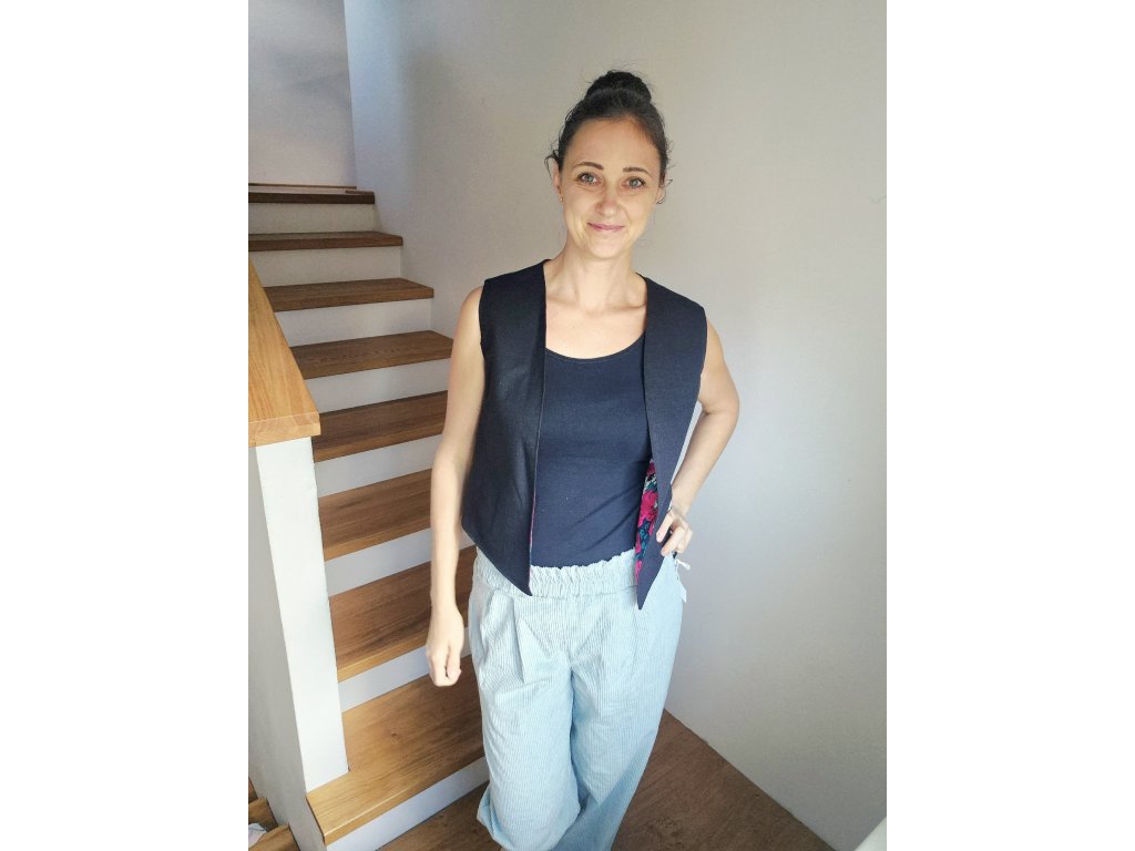 Elegantní vesta, která díky svému střihu působí nadčasově a snadno se kombinuje. Je ušitá z pevných, kvalitních materiálů – buď z hebkého manšestru, nebo ze směsi lnu, bavlny a viskózy. Přední díl je střižený do obloučku nebo do špičky a nemá zapínání, takže působí ležérně a vzdušně. Zajímavým detailem je vnitřní podšívka z barevného popelínu, která dodává vestě hravý kontrast a jemně ji oživí.