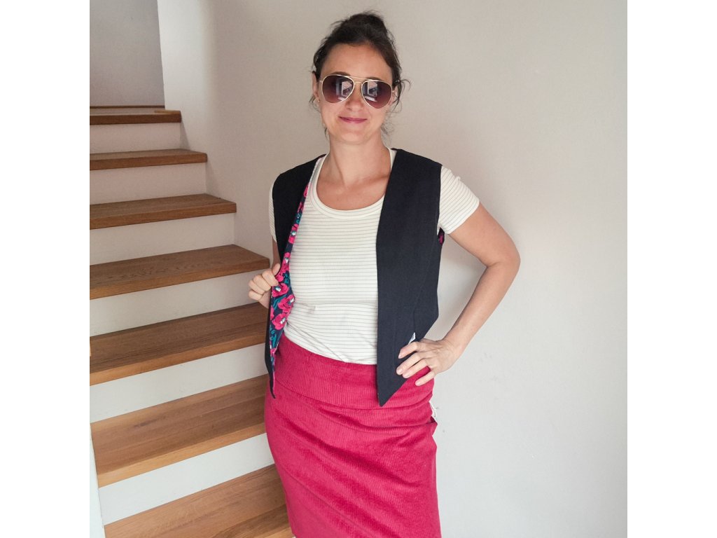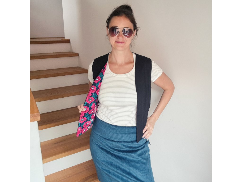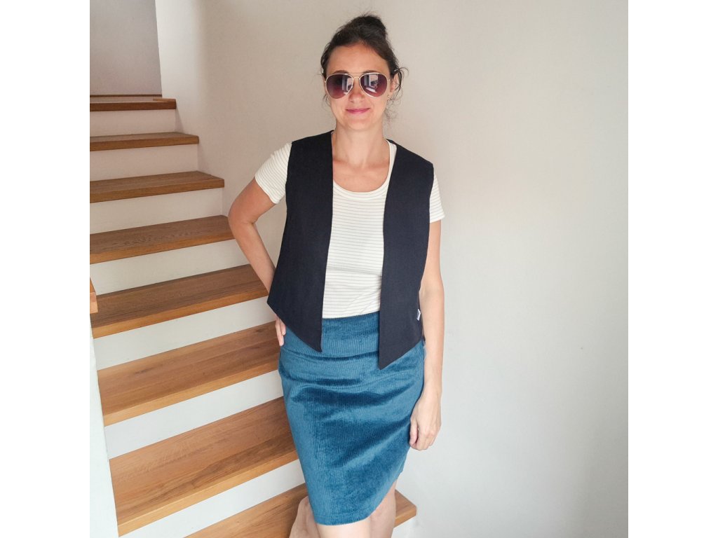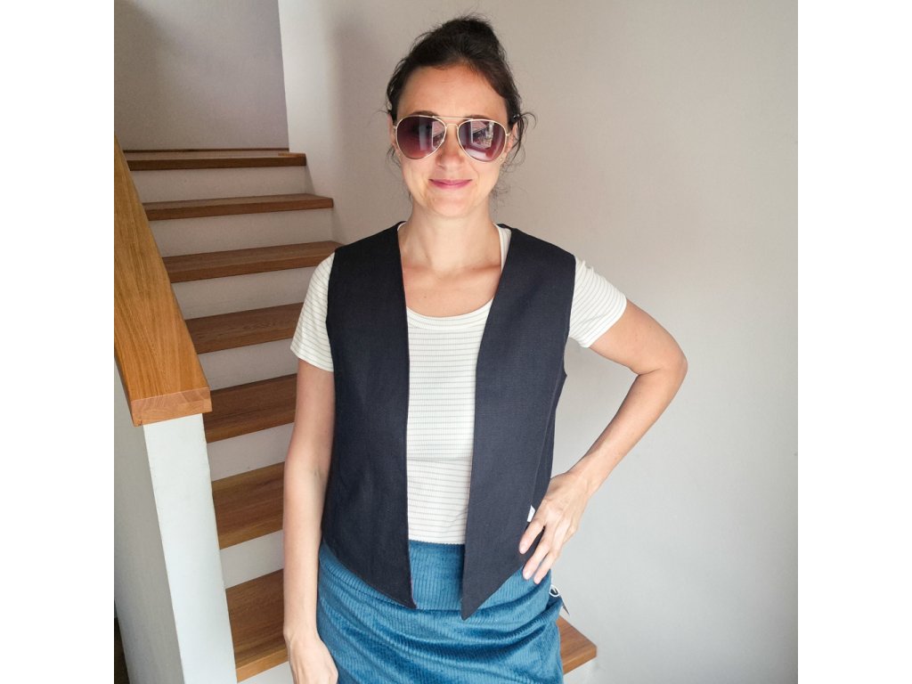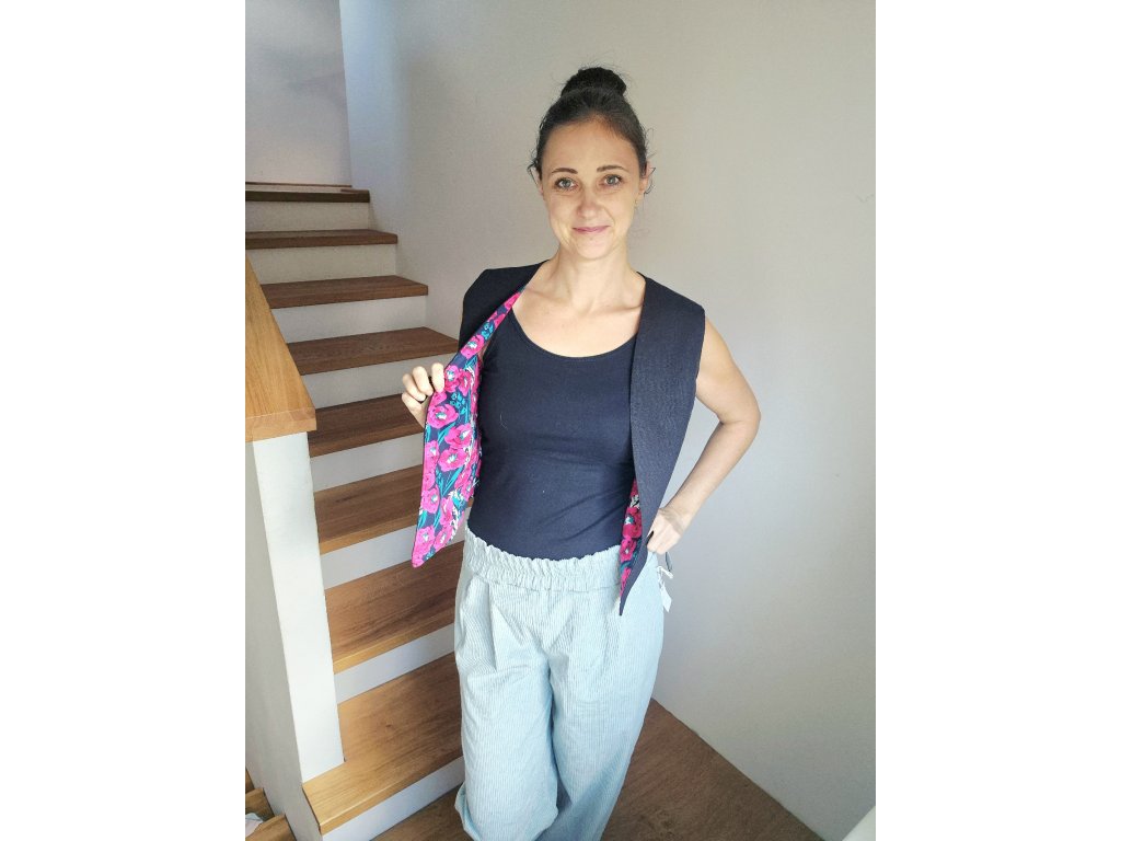 Elegantní vesta, která díky svému střihu působí nadčasově a snadno se kombinuje. Je ušitá z pevných, kvalitních materiálů – buď z hebkého manšestru, nebo ze směsi lnu, bavlny a viskózy. Přední díl je střižený do obloučku nebo do špičky a nemá zapínání, takže působí ležérně a vzdušně. Zajímavým detailem je vnitřní podšívka z barevného popelínu, která dodává vestě hravý kontrast a jemně ji oživí.