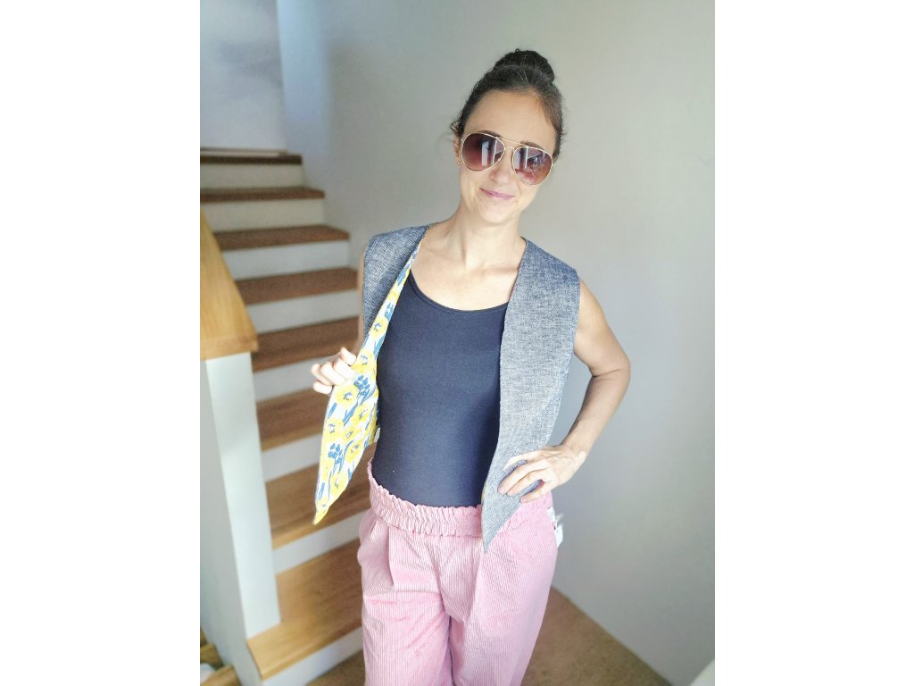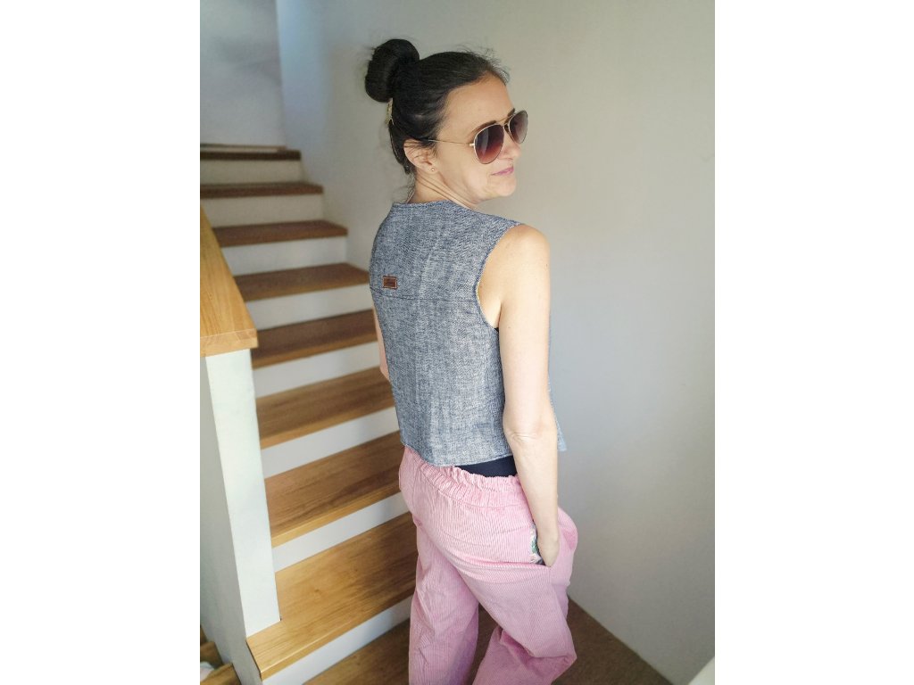 Elegantní vesta, která díky svému střihu působí nadčasově a snadno se kombinuje. Je ušitá z pevných, kvalitních materiálů – buď z hebkého manšestru, nebo ze směsi lnu, bavlny a viskózy. Přední díl je střižený do obloučku nebo do špičky a nemá zapínání, takže působí ležérně a vzdušně. Zajímavým detailem je vnitřní podšívka z barevného popelínu, která dodává vestě hravý kontrast a jemně ji oživí.