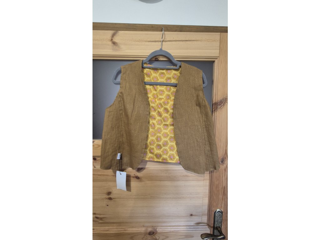 Elegantní vesta, která díky svému střihu působí nadčasově a snadno se kombinuje. Je ušitá z pevných, kvalitních materiálů – buď z hebkého manšestru, nebo ze směsi lnu, bavlny a viskózy. Přední díl je střižený do obloučku nebo do špičky a nemá zapínání, takže působí ležérně a vzdušně. Zajímavým detailem je vnitřní podšívka z barevného popelínu, která dodává vestě hravý kontrast a jemně ji oživí.