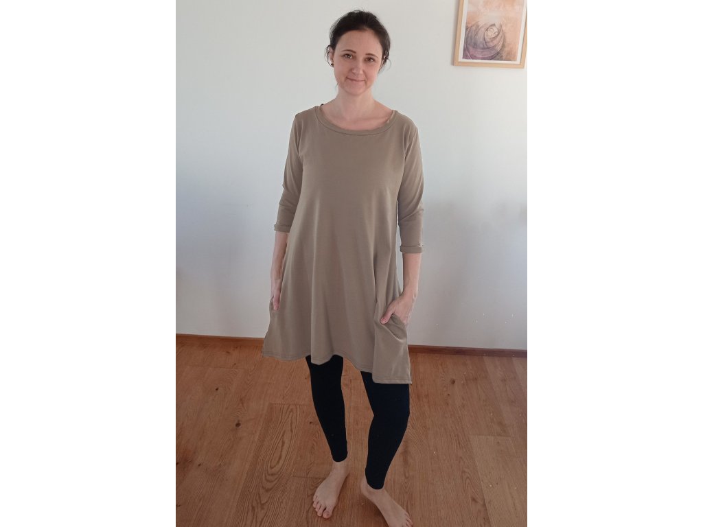 Pohodlné dámské šaty z měkkého úpletu s jemně rozšiřující se sukní do tvaru písmene A jsou skvělou volbou pro každý den. Tento střih lichotí postavě, poskytuje volnost pohybu a zároveň působí žensky a elegantně. Tříčtvrteční rukávy zajišťují celoroční využití. Praktické kapsy skryté v bočních švech přidávají na pohodlí i funkčnosti.