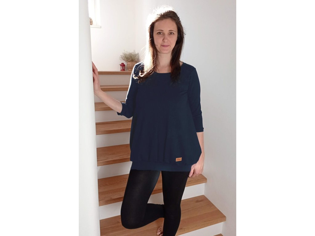 Dámské tričko volného střihu je ušité z příjemného úpletu, který se krásně přizpůsobí postavě. V oblasti hrudi lehce obepíná tělo, zatímco od pasu dolů přechází do volnější linie díky širokému záhybu, který vytváří pohodlný a lichotivý tvar. Tričko sahá pod oblast zad, což zajišťuje dostatečné krytí a příjemný pocit při nošení. Dolní okraj je zakončen všitým lemem, který jemně drží tvar a dodává celkovému vzhledu upravený dojem.