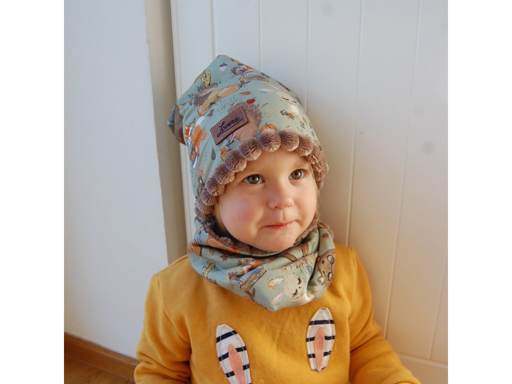 Pohodlná čepice ušitá z teplákoviny a vnitřní vrstva minky. Dvojité provedení zajišťuje větší tepelný komfort a chrání před větrem – ideální na podzimní až jarní období.