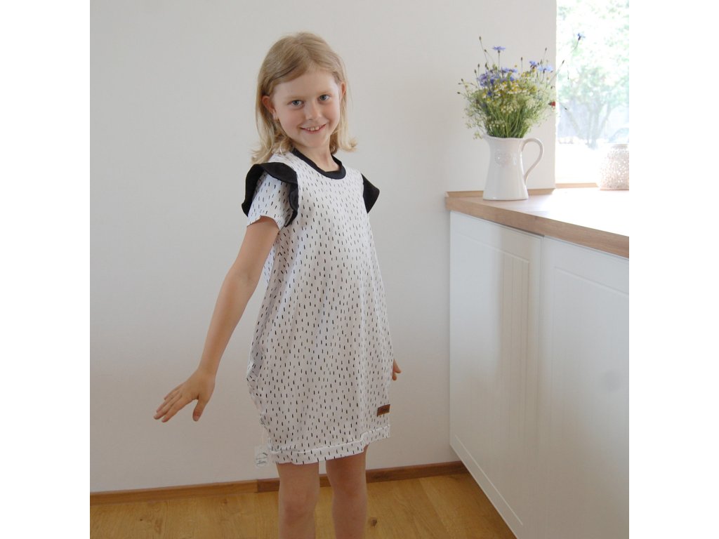 Dětské šaty jsou volného pohodlného střihu, v boční části mají trojúhelníkové vnitřní kapsy. Šaty jsou s krátkým rukávem vhodné na období od jara do podzimu.