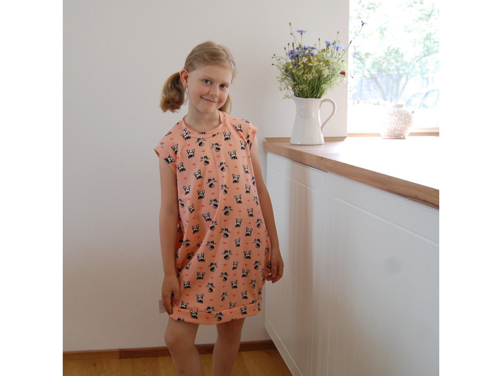 Dětské šaty jsou volného pohodlného střihu, v boční části mají trojúhelníkové vnitřní kapsy. Šaty jsou s krátkým rukávem vhodné na období od jara do podzimu.