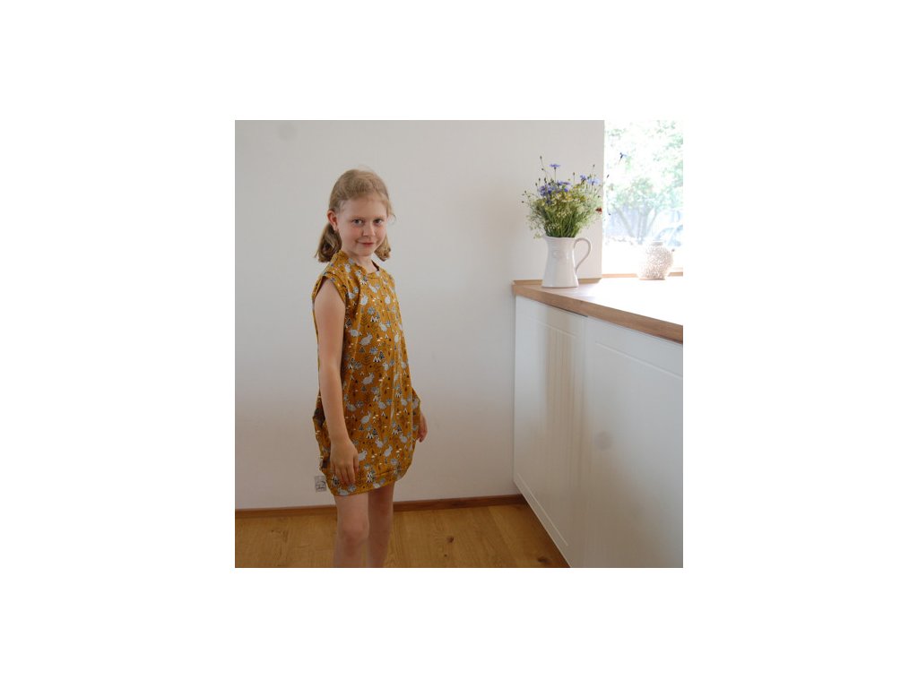 Dětské šaty jsou volného pohodlného střihu, v boční části mají trojúhelníkové vnitřní kapsy. Šaty jsou s krátkým rukávem vhodné na období od jara do podzimu.