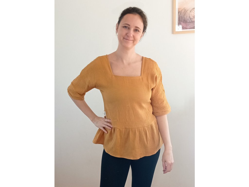 Lehká jako vánek, měkoučká na dotek – tato halenka z přírodní dvojité gázoviny je ztělesněním romantiky. Výstřih ve výraznějším tvaru U krásně rámuje dekolt a působí jemně ženským dojmem. Pod prsy přechází do volně nařasené, mírně rozšířené části, která připomíná drobnou sukýnku – lichotí siluetě a zároveň skryje to, co má zůstat jen tvým tajemstvím. Volnější 3/4 rukávy zajišťují pohodlí i ležérní styl. Skvěle se hodí k lněným kalhotám, džínům i maxi sukním – ať už míříš do města nebo na piknik mezi květy.