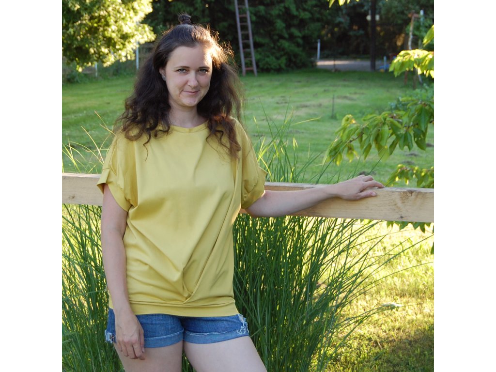 V oblasti břicha je halenka efektně překládaná, což vytváří volnější vzhled a elegantní tvar do „V“. Tento detail nejen opticky zeštíhluje, ale zároveň poskytuje pohodlí a jemně zakrývá případné nedokonalosti.
