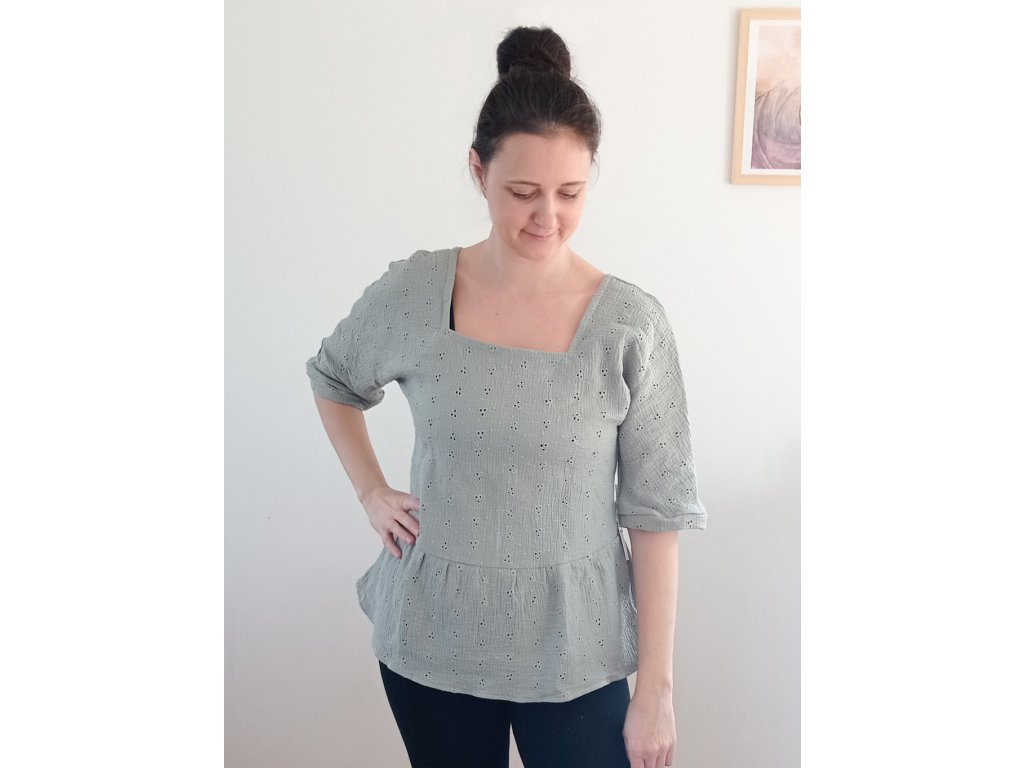 Lehká jako vánek, měkoučká na dotek – tato halenka z přírodní vyšívané dvojité gázoviny je ztělesněním romantiky. Výstřih ve výraznějším tvaru U krásně rámuje dekolt a působí jemně ženským dojmem. Pod prsy přechází do volně nařasené, mírně rozšířené části, která připomíná drobnou sukýnku – lichotí siluetě a zároveň skryje to, co má zůstat jen tvým tajemstvím. Volnější 3/4 rukávy zajišťují pohodlí i ležérní styl. Skvěle se hodí k lněným kalhotám, džínům i maxi sukním – ať už míříš do města nebo na piknik mezi květy.