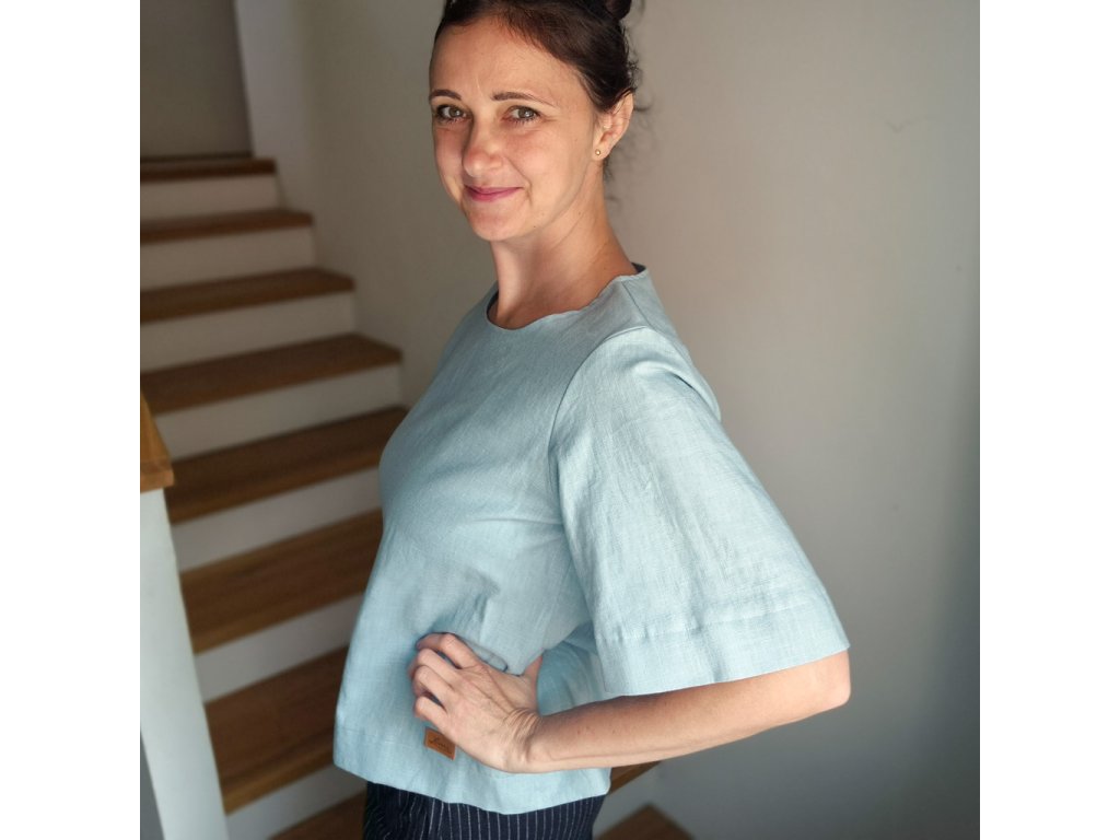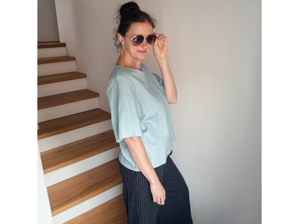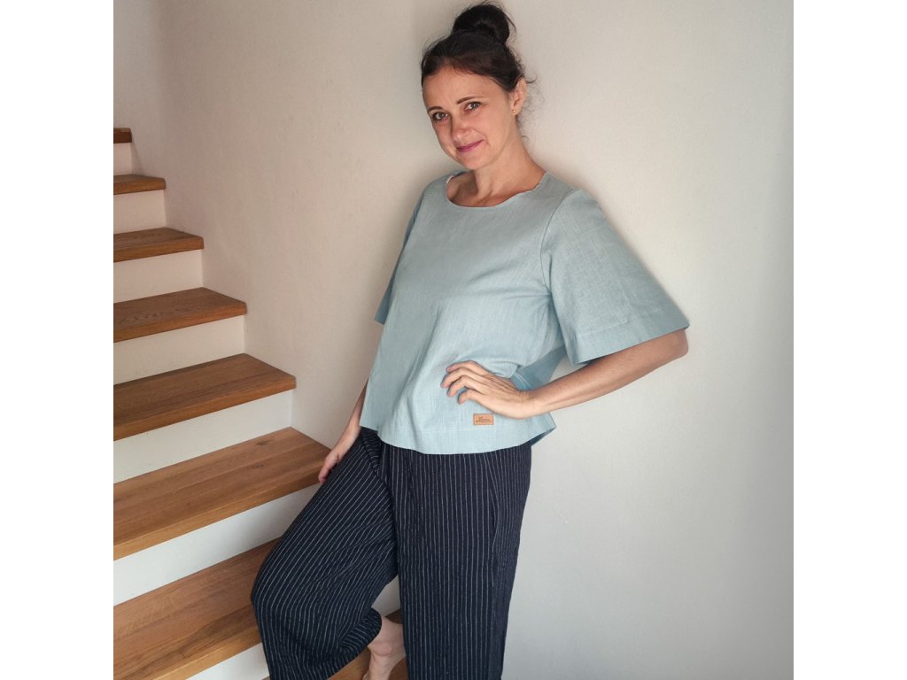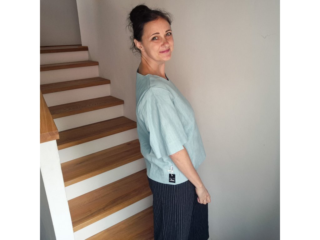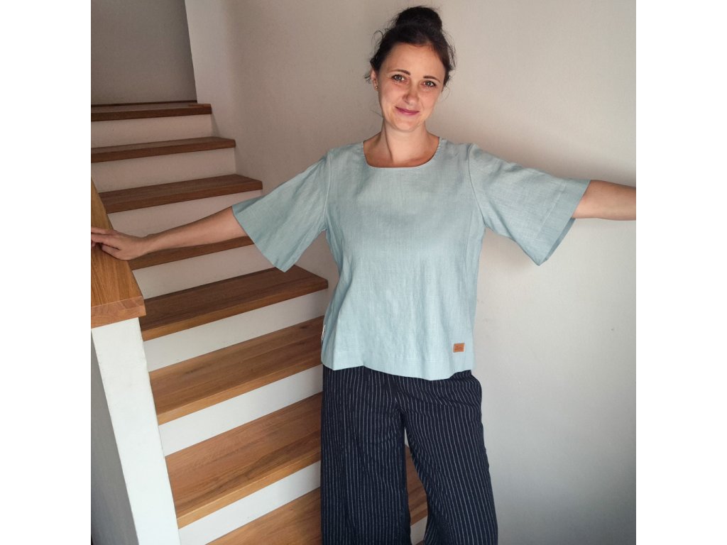 Lněná halenka je šitá ve volnějším střihu, který působí pohodlně a svěže. Díky univerzálnímu provedení padne velikostem 36 až 40. Rukávy sahají pod lokty a směrem dolů se rozšiřují, což dodává celému kousku lehkost a vzdušný charakter. Madeira se svou jemnou strukturou podtrhuje čistý a nadčasový vzhled. Len jako přírodní materiál je příjemný na těle, dobře dýchá a s postupem času získává ještě větší měkkost.