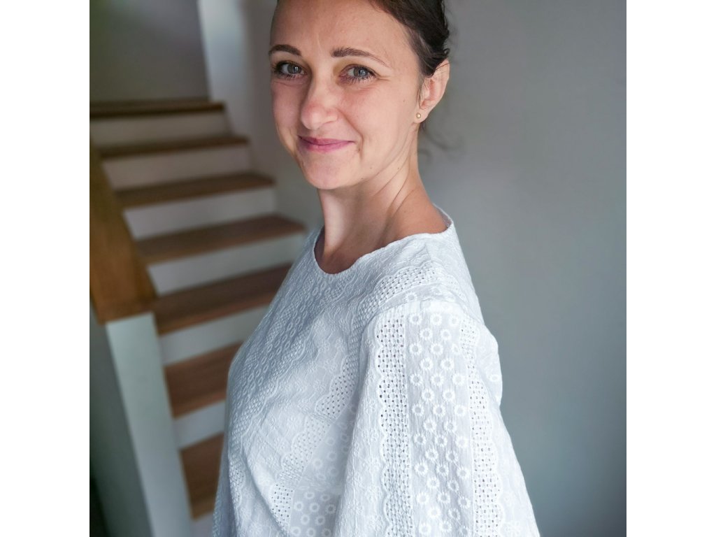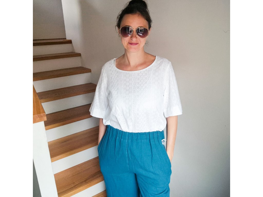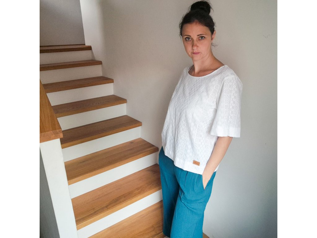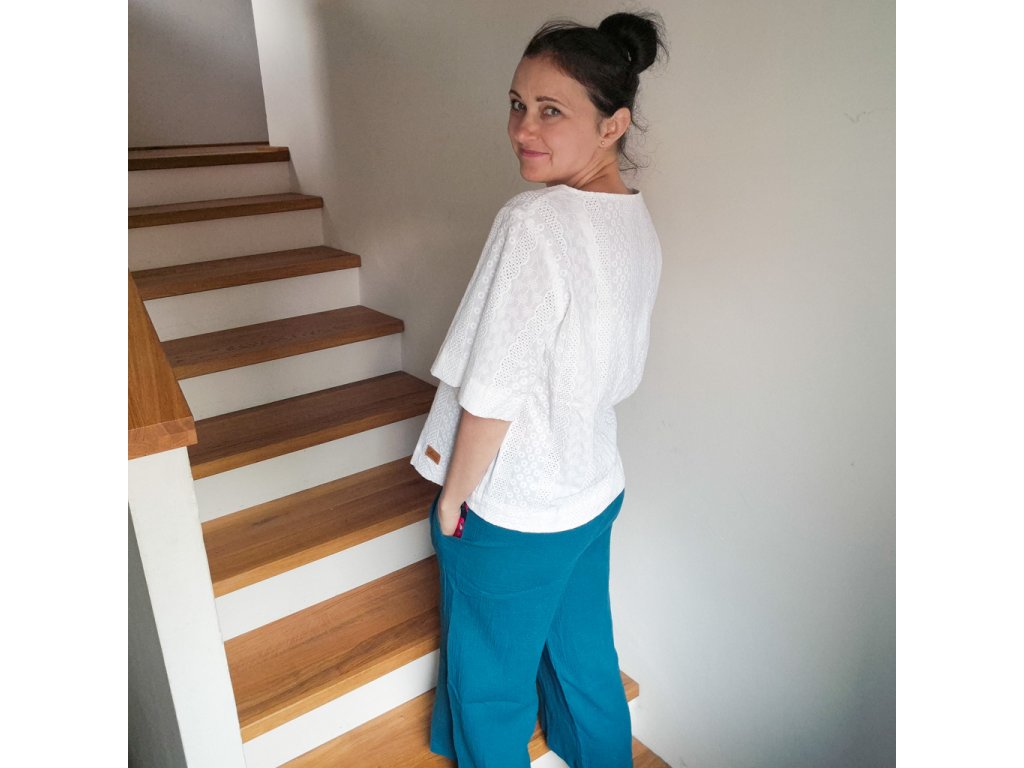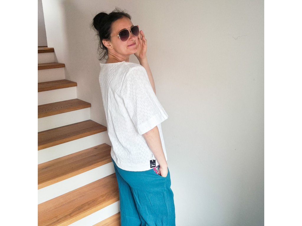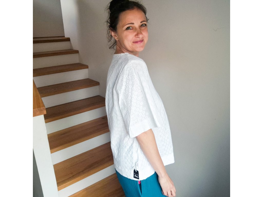 Halenka z jemné bílé madeiry je šitá ve volnějším střihu, který působí pohodlně a svěže. Díky univerzálnímu provedení padne velikostem 36 až 40. Rukávy sahají pod lokty a směrem dolů se rozšiřují, což dodává celému kousku lehkost a vzdušný charakter. Madeira se svou jemnou strukturou podtrhuje čistý a nadčasový vzhled.