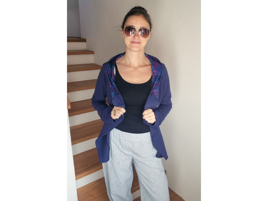 Kabátek má praktickou kapucí, jejíž vnitřní strana je z designového úpletu – ten dodává originální kontrast a zajímavý detail.