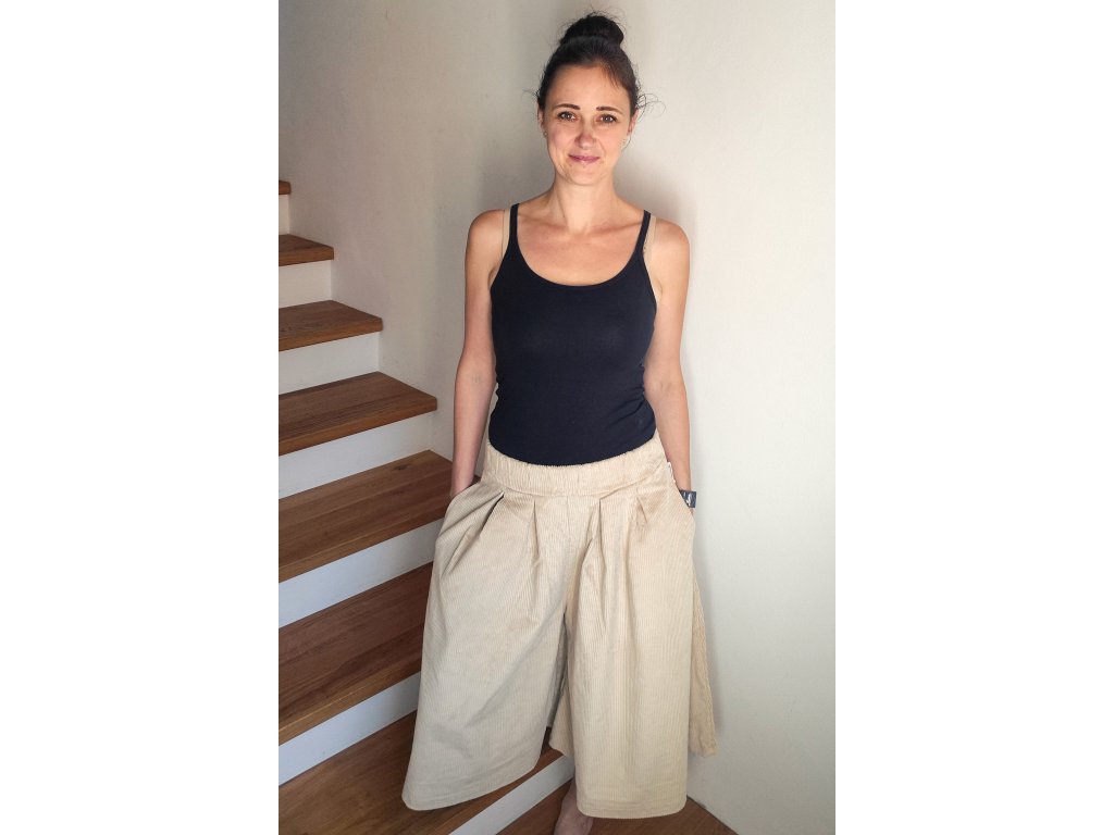 Kalhotová sukně je ušitá z manšestru, který je hebký a díky složení s elastanem i velmi pohodlný a příjemný na nošení.