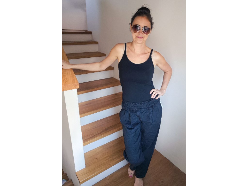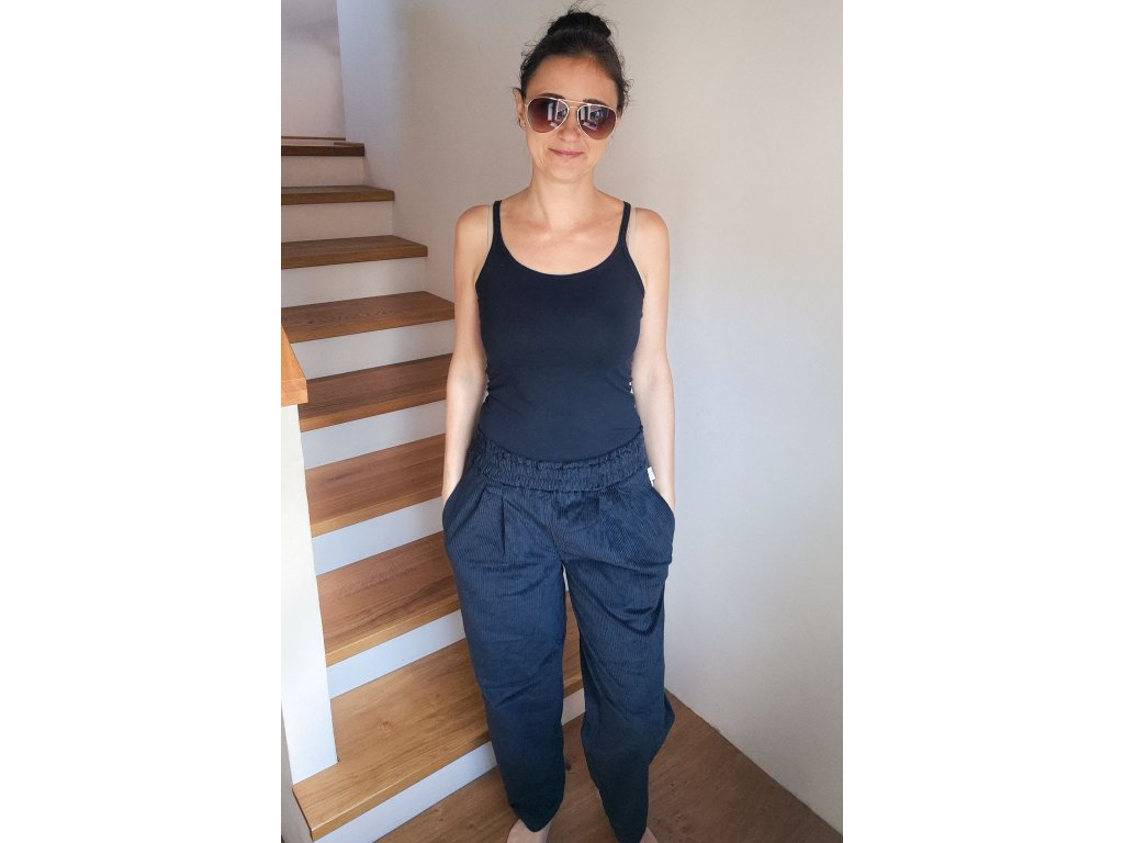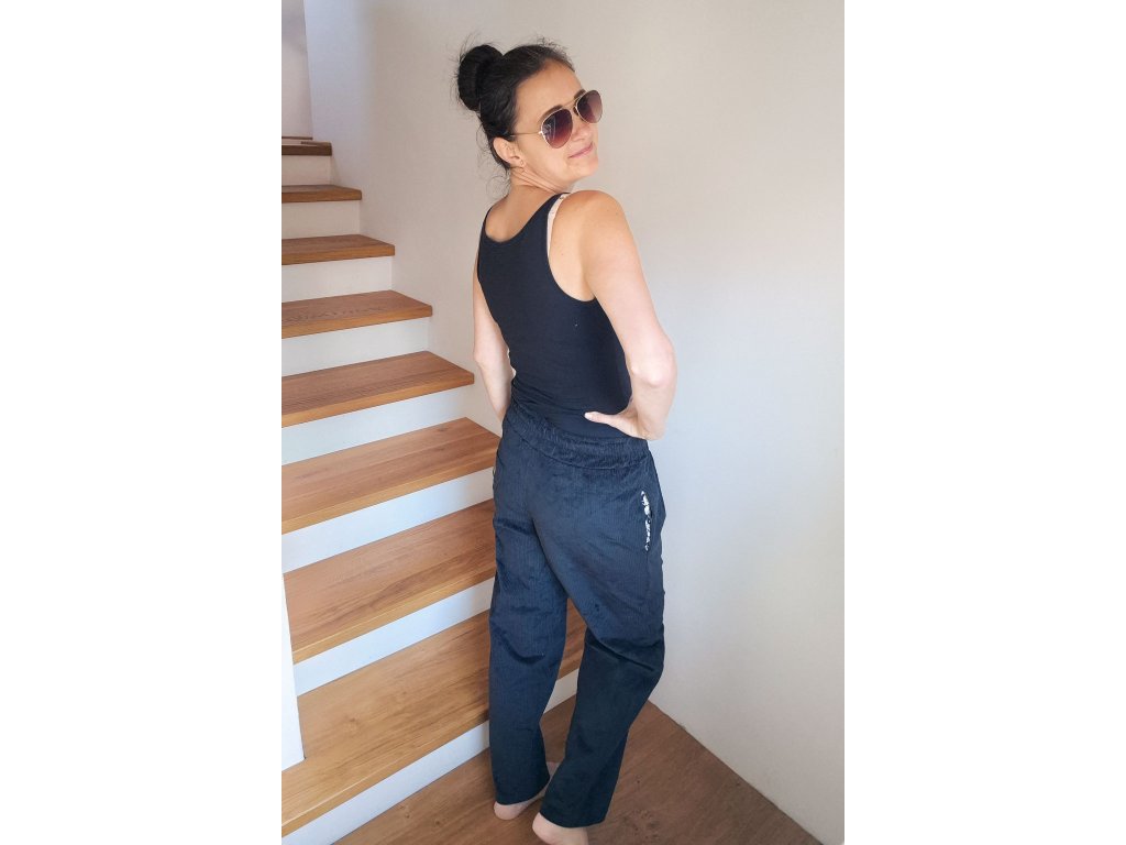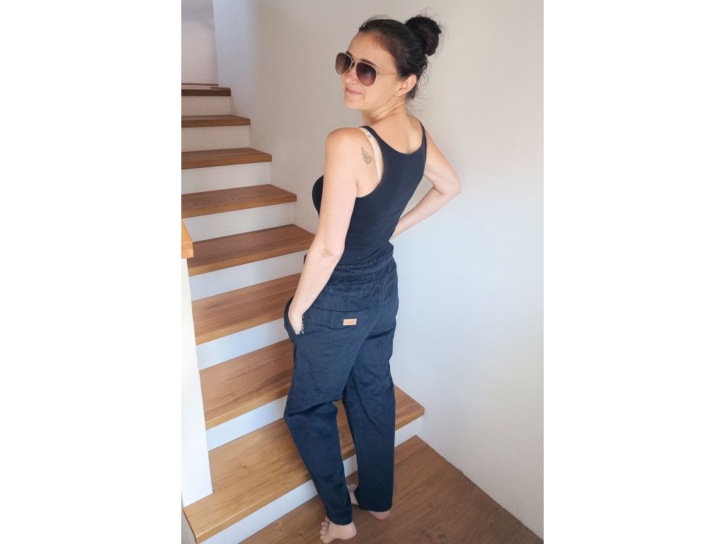 Kalhoty jsou ušité ze silnějšího pružného manšestru, který je velmi příjemný na dotek a díky chloupku a charakteristickým svislým proužkům má zajímavý vzhled.