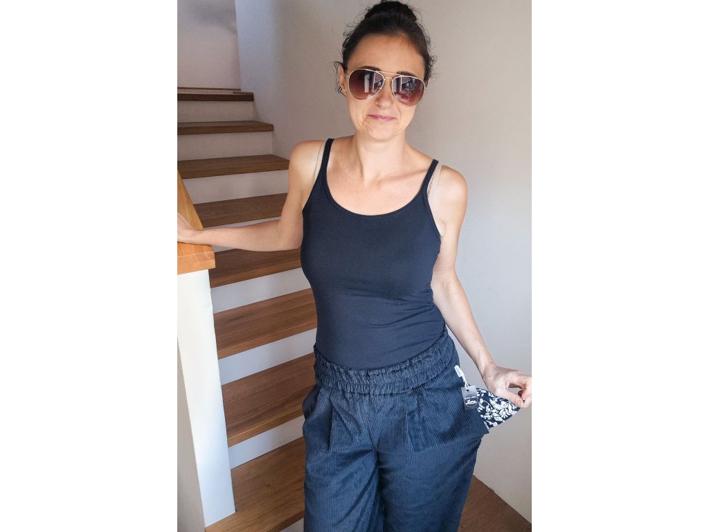 Jemné záhyby na přední straně dodávají modelu tvar a lehkou strukturu, která lichotí postavě. V bočním švu je všitá kapsa z designového plátna a na zadním díle originální trojúhelníková kapsa. Pasový lem je prošitý a vyzývá vás si tentokrát tričko dát do kalhot a třeba jen mírně podkasat.