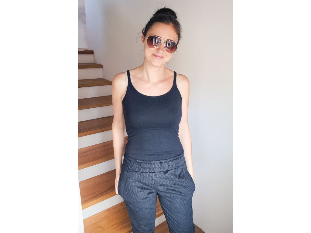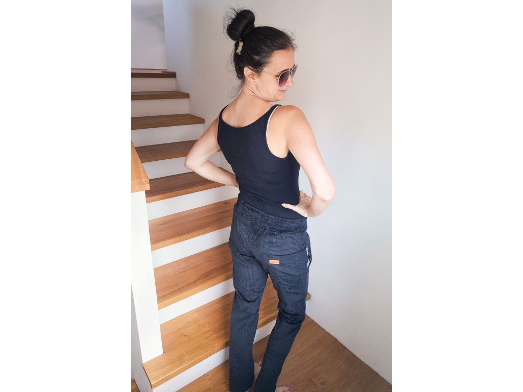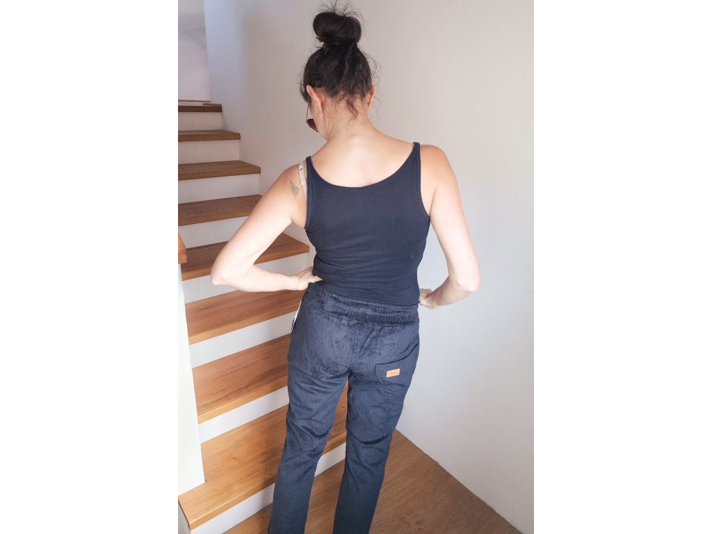 Kalhoty jsou ušité ze silnějšího pružného manšestru, který je velmi příjemný na dotek a díky chloupku a charakteristickým svislým proužkům má zajímavý vzhled.