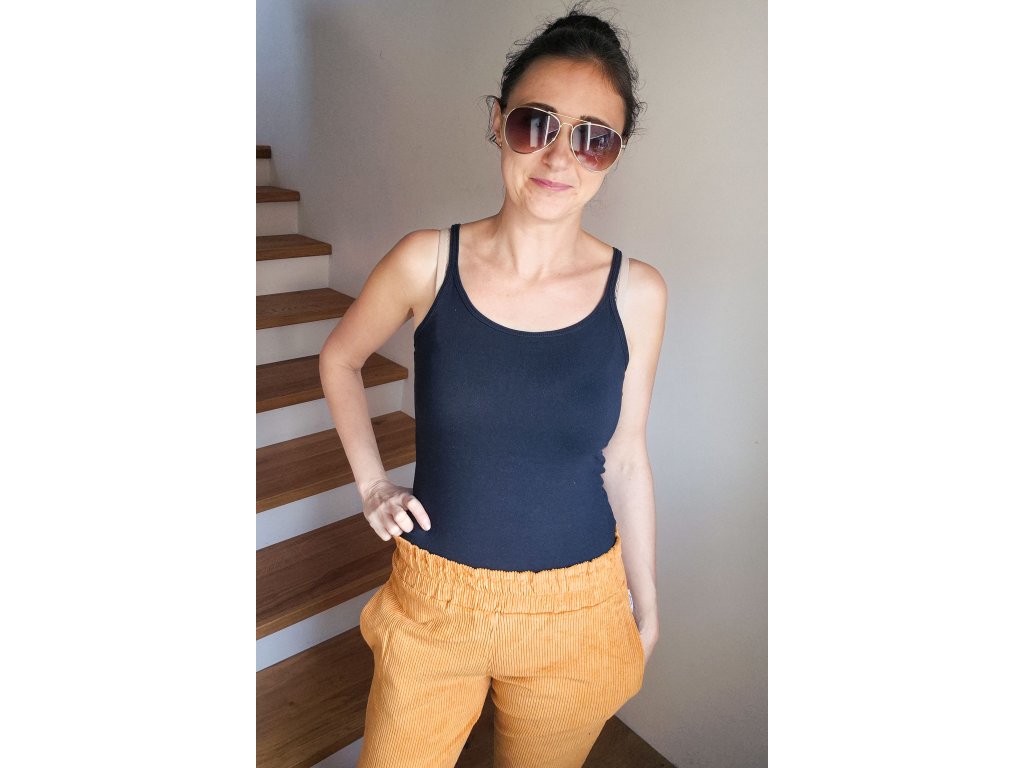 Kalhoty jsou ušité ze silnějšího pružného manšestru, který je velmi příjemný na dotek a díky chloupku a charakteristickým svislým proužkům má zajímavý vzhled.