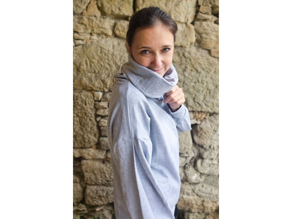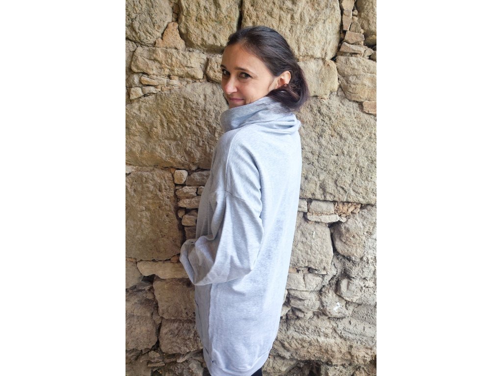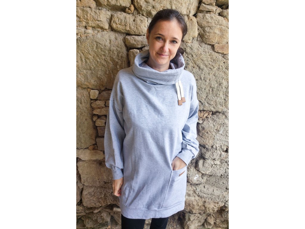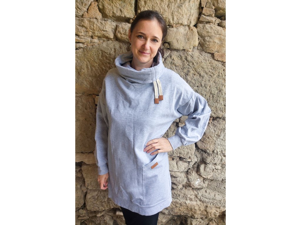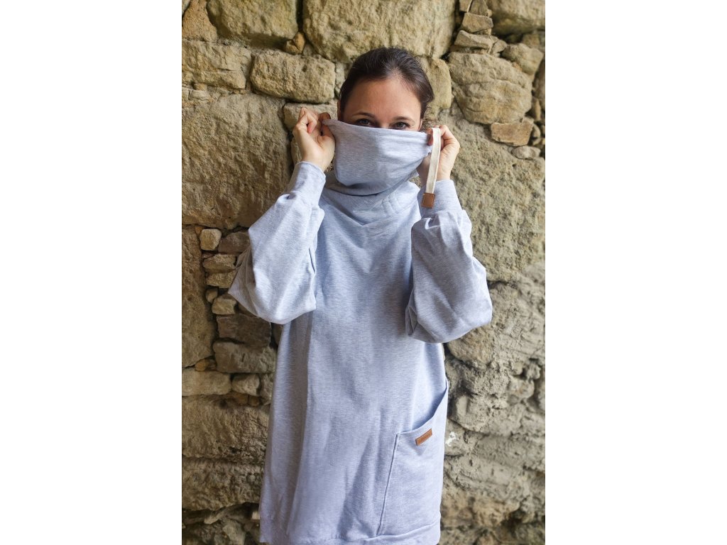 Dlouhá mikina s vysokým stojáčkem, který je doplněný šňůrkou na stažení, což dodává celkovému vzhledu mikiny ještě originálnější ráz. Mikina je volného střihu a na předním díle je praktická kapsa. U ramenního švu je na rukávu složený protizáhyb, aby byl rukáv ještě pohodlnější.