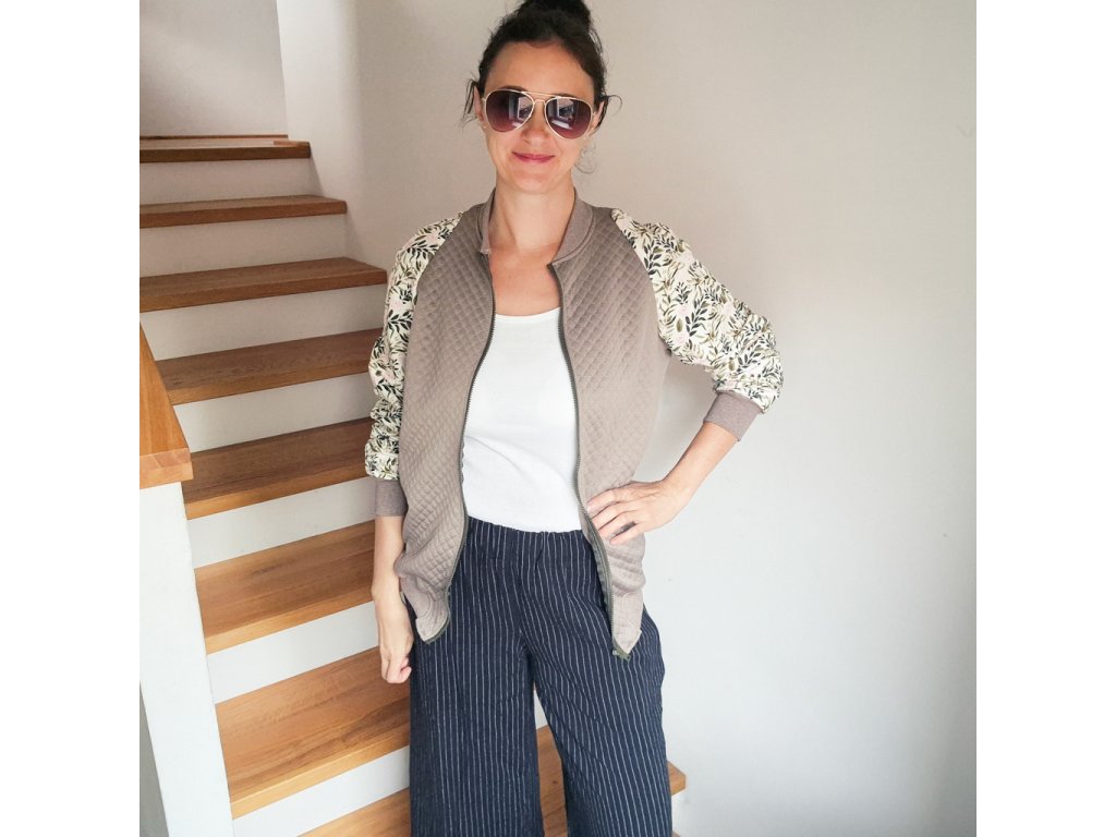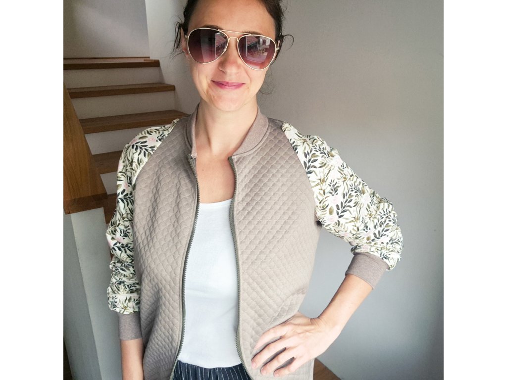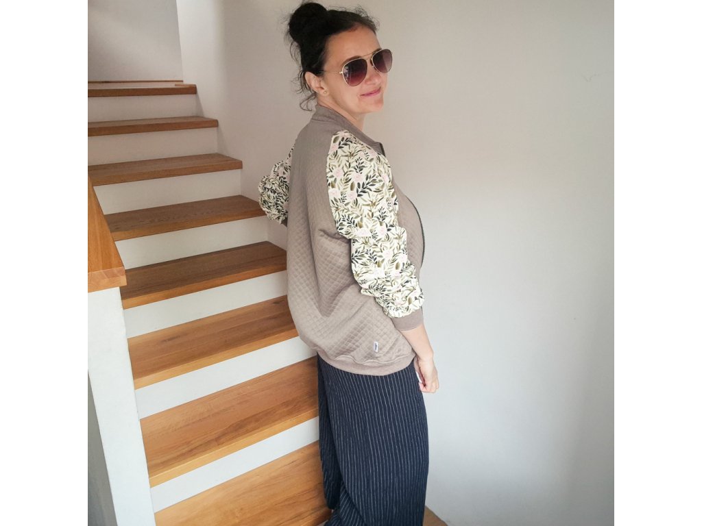 Mikina je ušitá z prošívané viskózové teplákoviny v kombinaci s designovou smyčkovou teplákovinou s motivy lístků a růžiček.