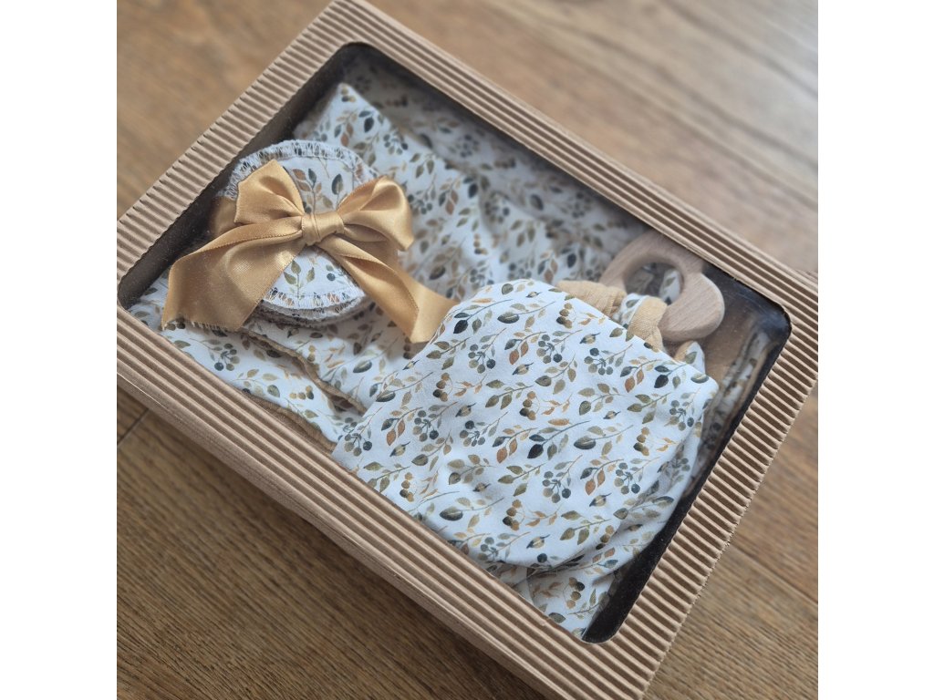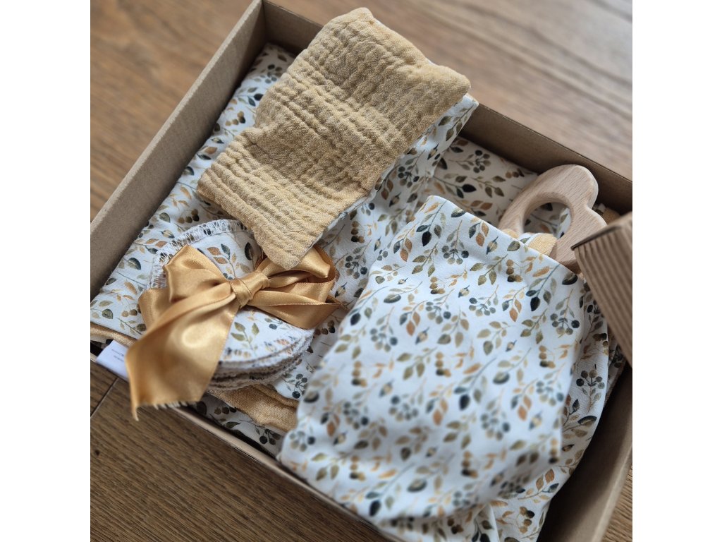 A co balíček obsahuje? Základem je vždy deka, odličovací tampónky, vonný pytlíček a dřevěné kousátko s plínkou na otření slin, muchláček na spinkání nebo tepláčky.