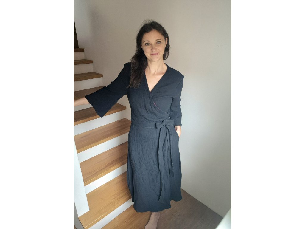 Objevte kouzlo jednoduchosti a přirozené krásy v těchto delších šatech z dvojité gázoviny. Zavinovací střih pod linií pasu krásně tvaruje siluetu, zatímco zvonové rukávy dodávají celému modelu jemný, romantický nádech. Díky zavinovacímu řešení se snadno oblékají a umožňují nastavit si šířku podle potřeby.