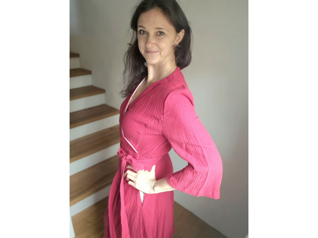Objevte kouzlo jednoduchosti a přirozené krásy v těchto delších šatech z dvojité gázoviny. Zavinovací střih pod linií pasu krásně tvaruje siluetu, zatímco zvonové rukávy dodávají celému modelu jemný, romantický nádech. Díky zavinovacímu řešení se snadno oblékají a umožňují nastavit si šířku podle potřeby.
