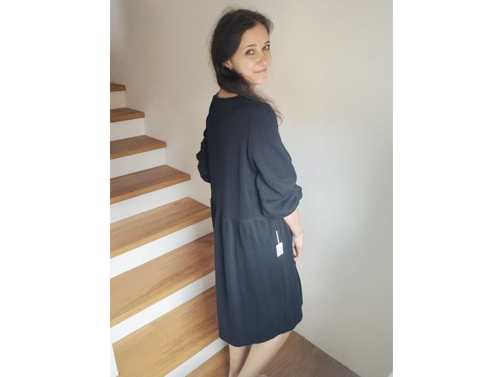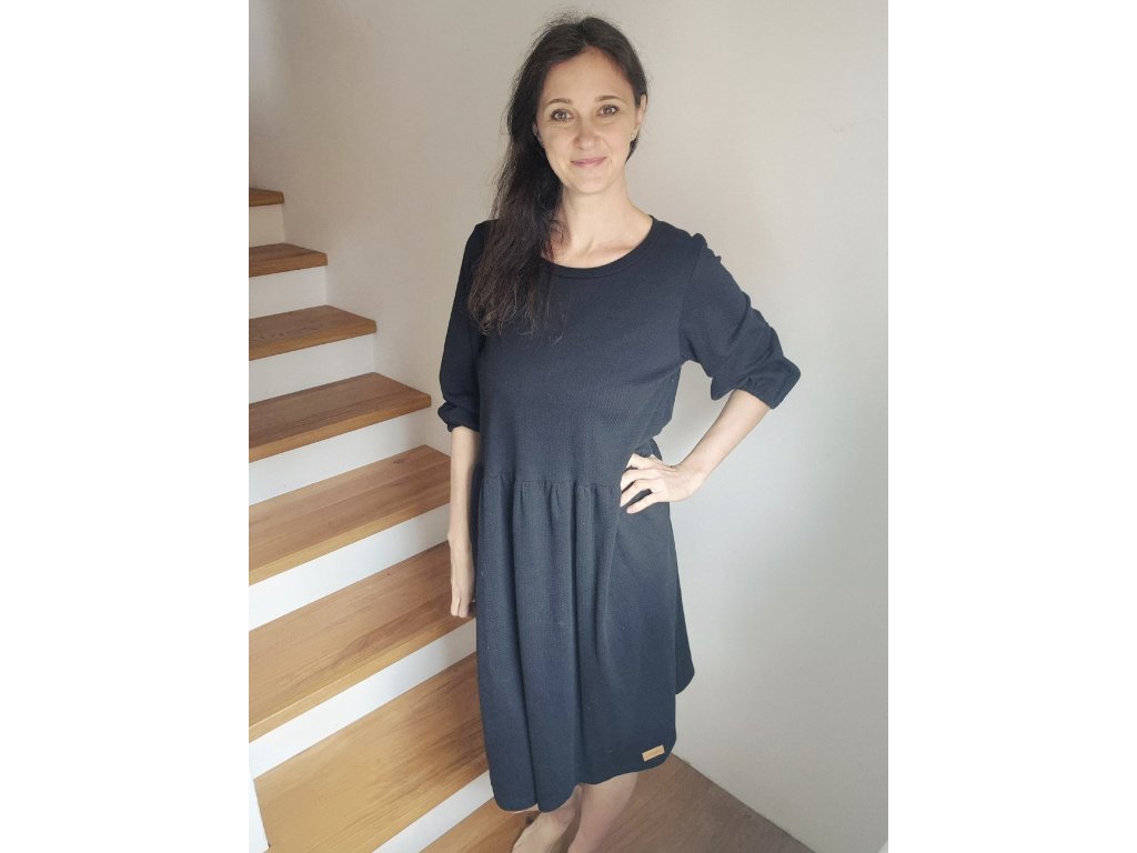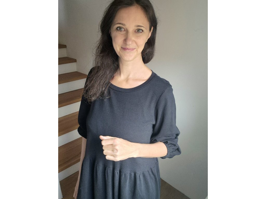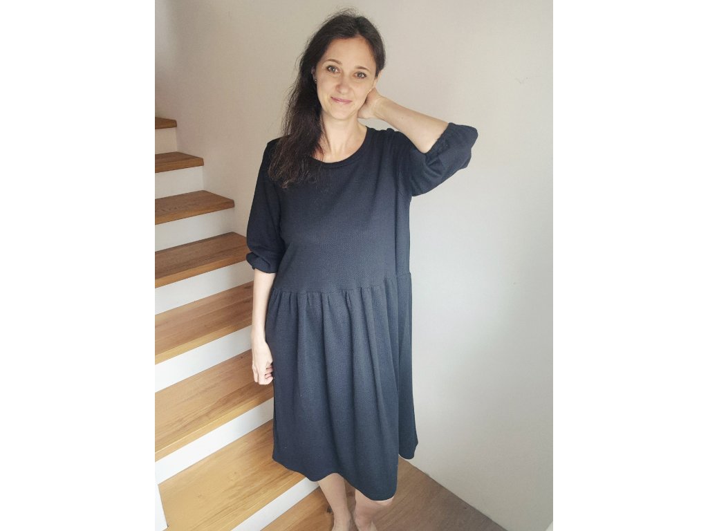 Šaty Pampeliška jsou volného střihu přestřižené v pase, spodní díl je nařasený. Rukávy jsou široké řasené do gumy, kterou můžete díky montážnímu otvoru upravovat. Ušité jsou z příjemného designového úpletu.