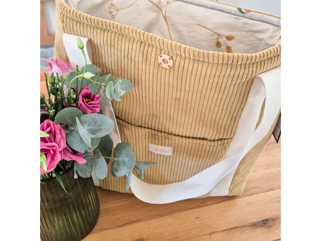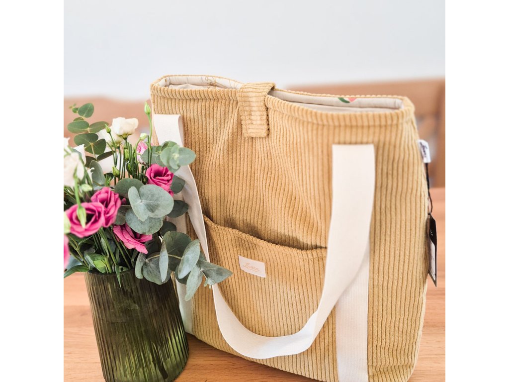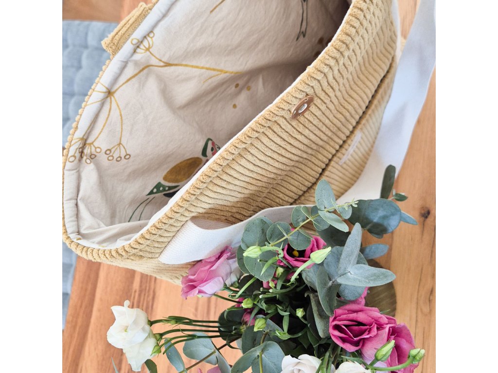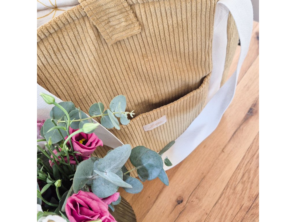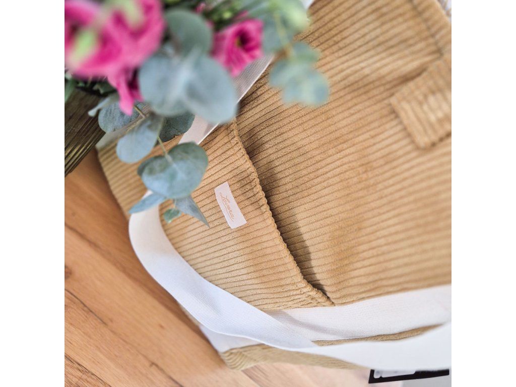 Designová taška ušitá z hebkého manšestru se stane praktickým doplňkem pro každý den. Vnitřek je podšitý originální tkaninou, která dodává tašce osobitý charakter. Díky pevným bavlněným popruhům se nosí pohodlně na rameni, takže je ideální na běžné pochůzky i delší denní nošení. Taška nabízí dostatek prostoru pro všechny nezbytnosti a spojuje jednoduchý tvar s jedinečným designem.