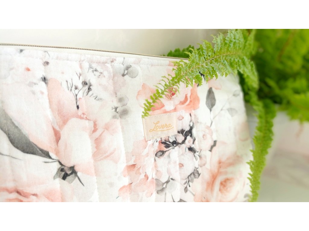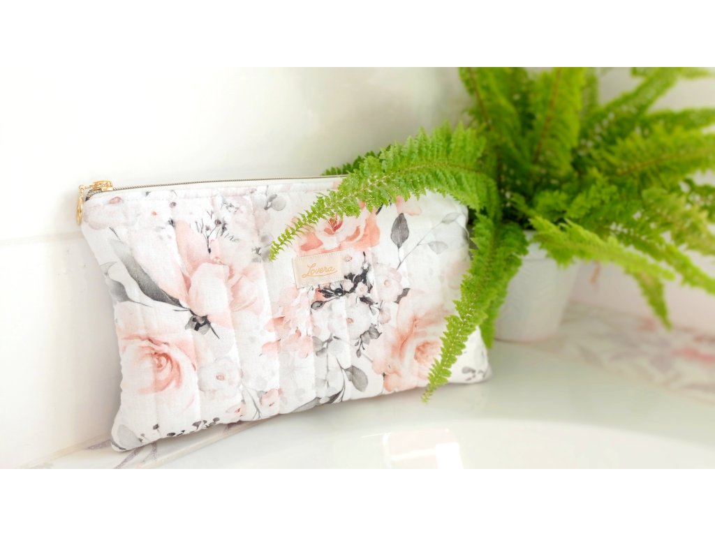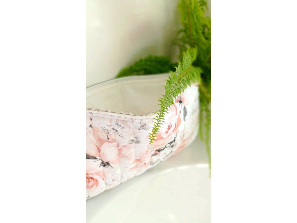 Hledáte elegantní jemnou kosmetickou taštičku? Tak tato je přímo pro vás. Materiál zdobený potiskem s motivem kytiček. Taštička je opatřena elegantním zlato-bílým zipem. Vrchní strana je ozdobně prošitá, což dodává taštičce originální vzhled. Uvnitř je bavlněná podšívka a taštička je vyztužena vatelínem, díky kterému je měkká, drží tvar a chrání kosmetiku, která je uvnitř.