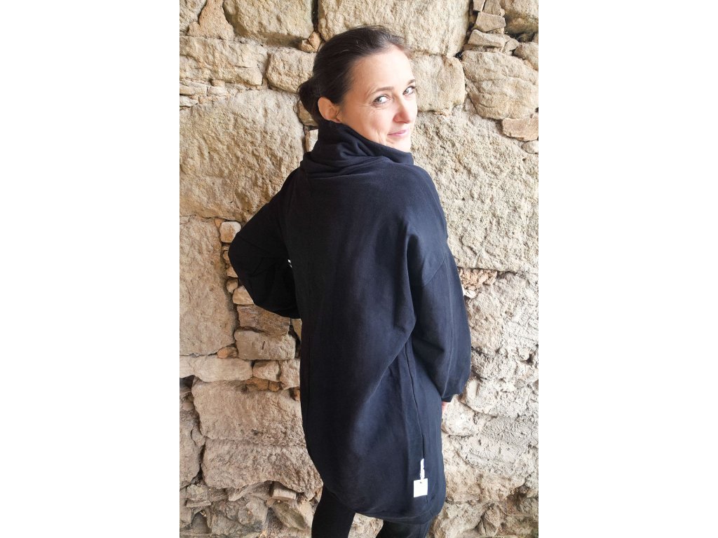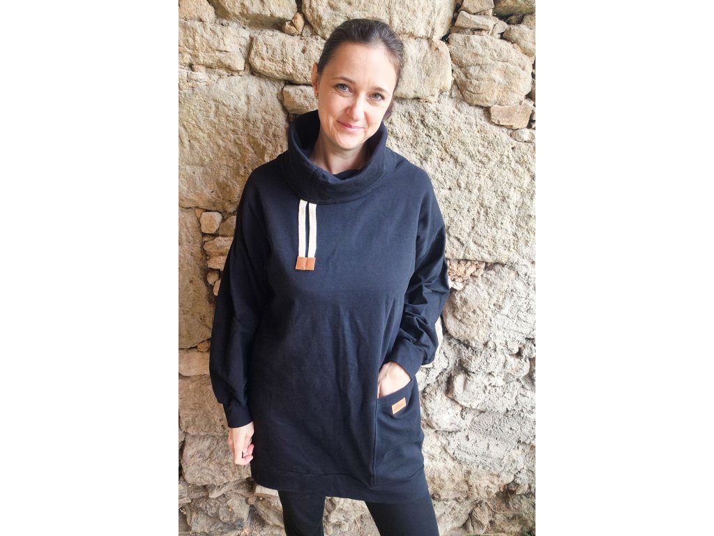 Dlouhá mikina s vysokým stojáčkem, který je doplněný šňůrkou na stažení, což dodává celkovému vzhledu mikiny ještě originálnější ráz.  Mikina je volného střihu a na předním díle je praktická kapsa. U ramenního švu je na rukávu složený protizáhyb, aby byl rukáv ještě pohodlnější.