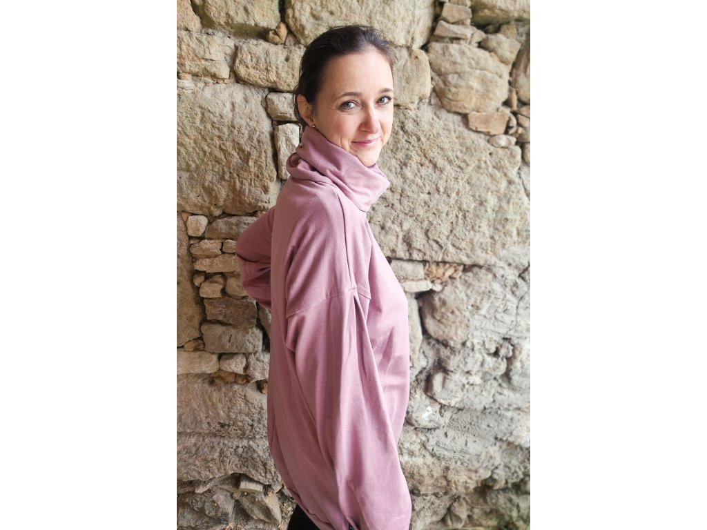 Dlouhá mikina s vysokým stojáčkem. Mikina je volného střihu a u ramenního švu je na rukávu složený protizáhyb, aby byl rukáv ještě pohodlnější.