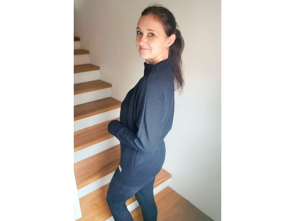 Mikina má charakteristický netopýří rukáv, který dodává volnost pohybu a zároveň vytváří elegantní a moderní siluetu. Rukáv je dostatečně dlouhý a díky lemu je možné jeho délku korigovat. Stojáček je zpracován bez viditelných stehů, což zajišťuje maximální komfort a čistý minimalistický vzhled. Mikina má delší střih a zadní díl je mírně prodloužený, takže vás krásně zahřeje i v zadních partiích a je možné ji tak kombinovat s pohodlnými legínami.