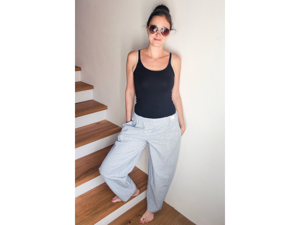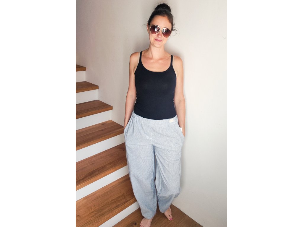 Kalhoty jsou ideální pro běžné nošení. Přírodní materiál zajišťuje skvělou cirkulaci vzduchu a savost, zatímco volnější střih v oblasti kolen a pruženka v pase poskytuje volnost pohybu a neomezený komfort po celý den. Kalhoty jsou opatřeny praktickými kapsami ve švu, ty jsou  vyrobené z designového plátna. Přední díl je členěný svisle dolů a na zadním díle je originální trojúhelníková kapsa.