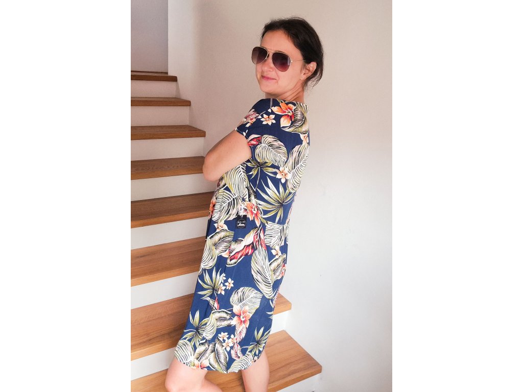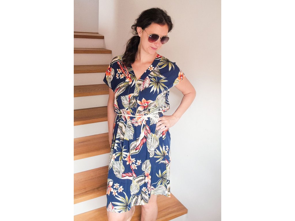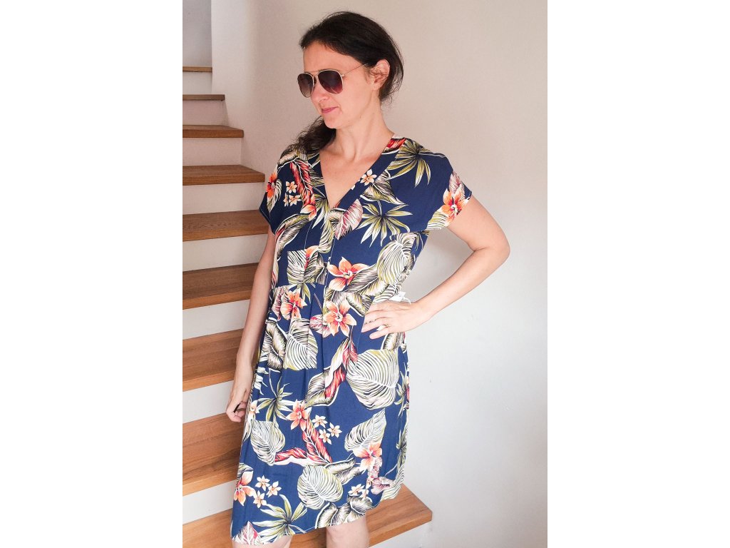 Dámské šaty ušité z viskózy jsou ideální volbou pro letní období. Lehký, vzdušný a splývavý materiál příjemně chladí na těle. Šaty jsou volného střihu s výstřihem do V a v pase mírně řasené.