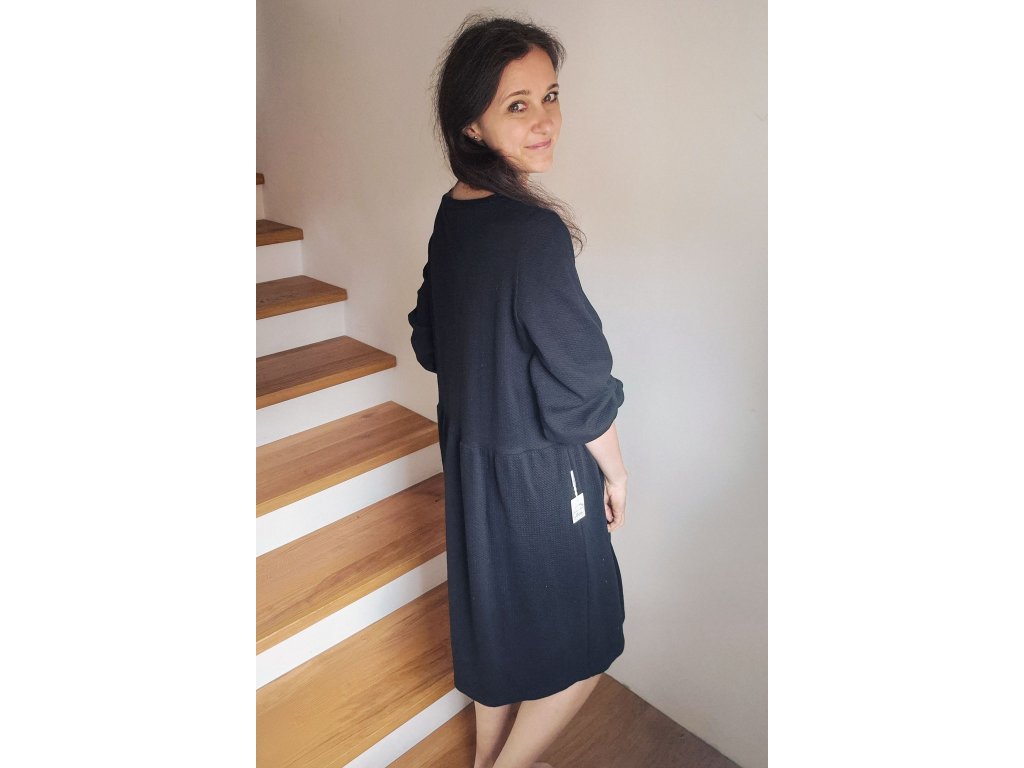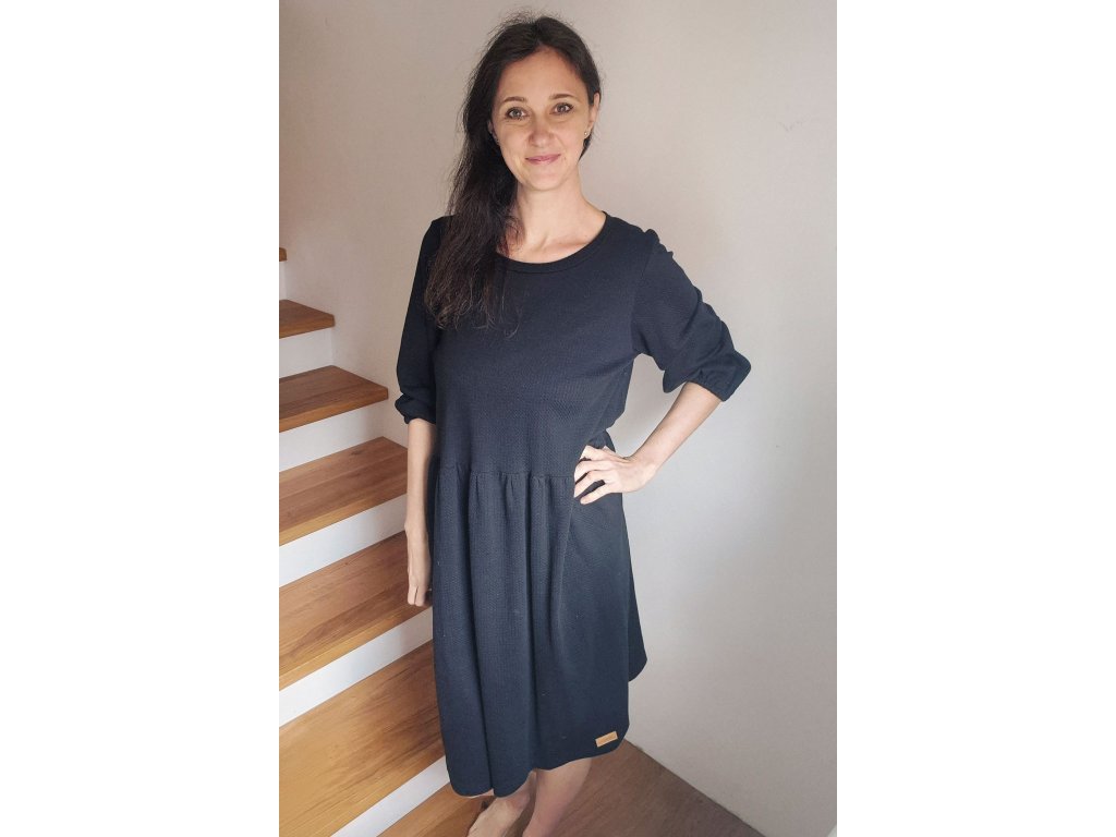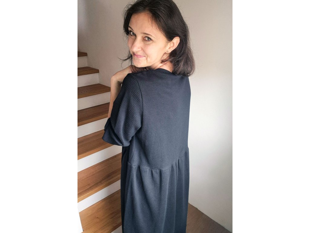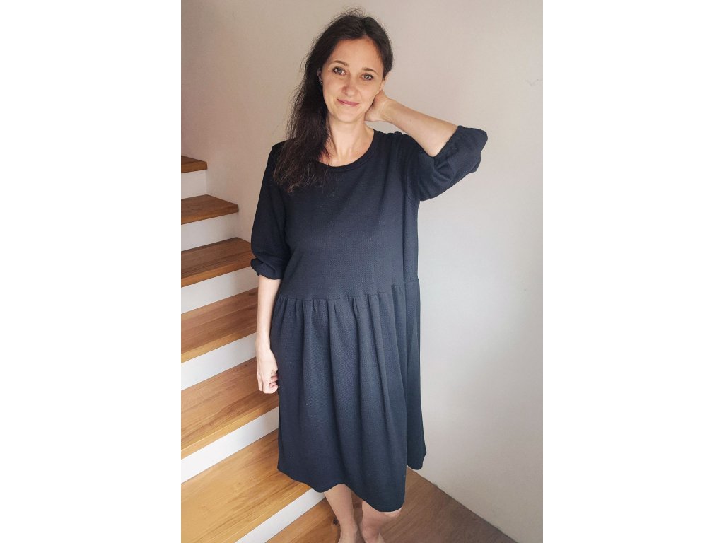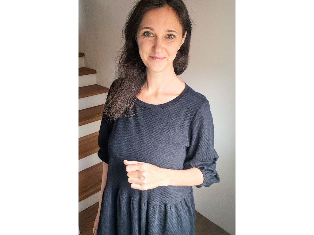 Šaty Pampeliška jsou volného střihu přestřižené v pase, spodní díl je nařasený. Rukávy jsou široké řasené do gumy, kterou můžete díky montážnímu otvoru upravovat. Ušité jsou z příjemného designového úpletu.