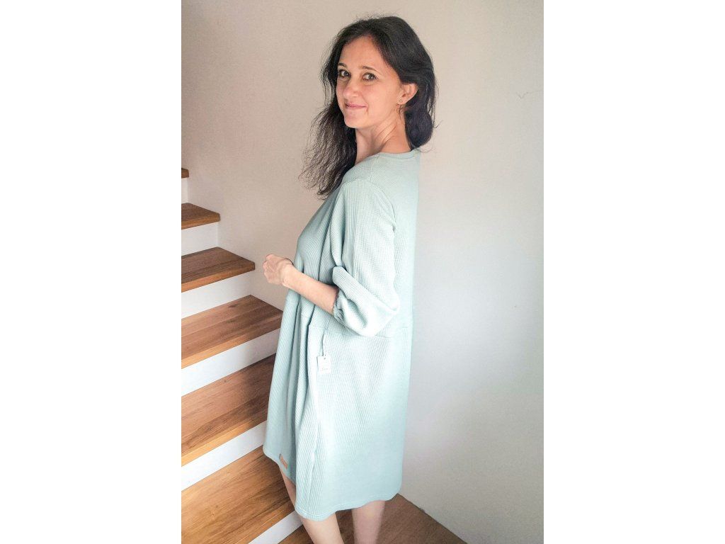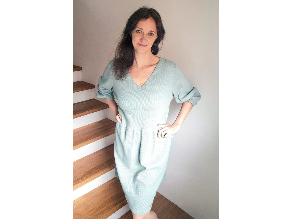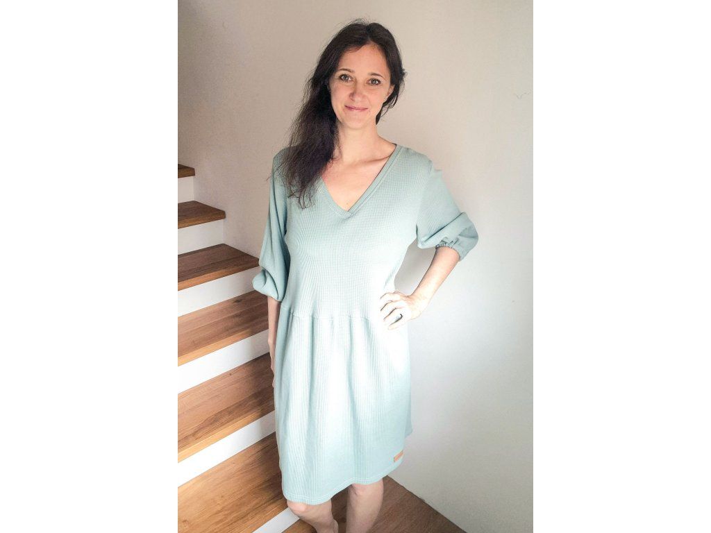 Šaty Pampeliška jsou volného střihu přestřižené v pase, spodní díl je nařasený. Rukávy jsou široké řasené do gumy, kterou můžete díky montážnímu otvoru upravovat. Průkrčník je řešený do tvaru V. U šatů oceníte i kapsy, které jsou umístěné v bočním švu a ušité z designového plátna. Šaty jsou ušité z příjemného silnějšího vaflového úpletu, tedy je možné je nosit i jako vrchní vrstvu na tričko nebo v období od podzimu na jara.