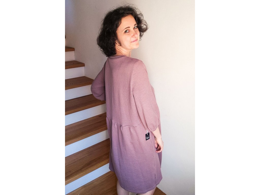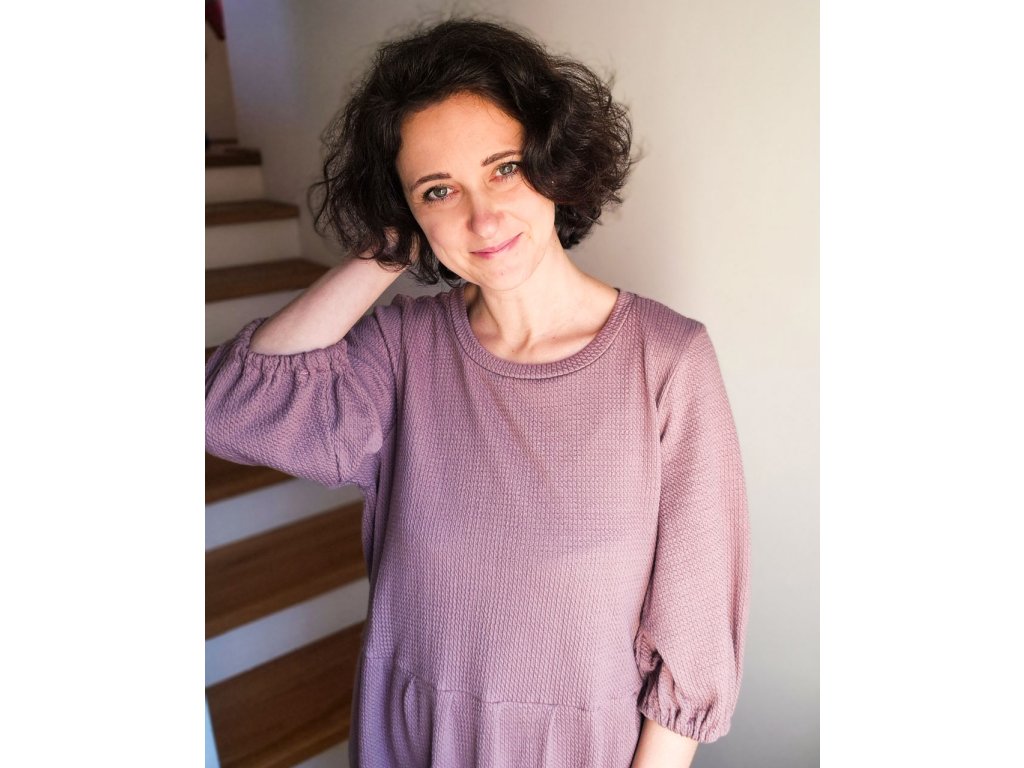Šaty Pampeliška jsou volného střihu přestřižené v pase, spodní díl je nařasený. Rukávy jsou široké řasené do gumy, kterou můžete díky montážnímu otvoru upravovat. Ušité jsou z příjemného designového úpletu.